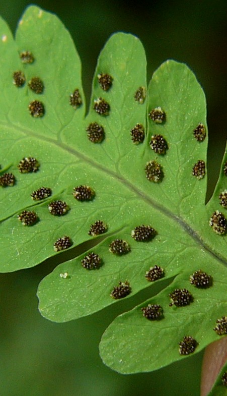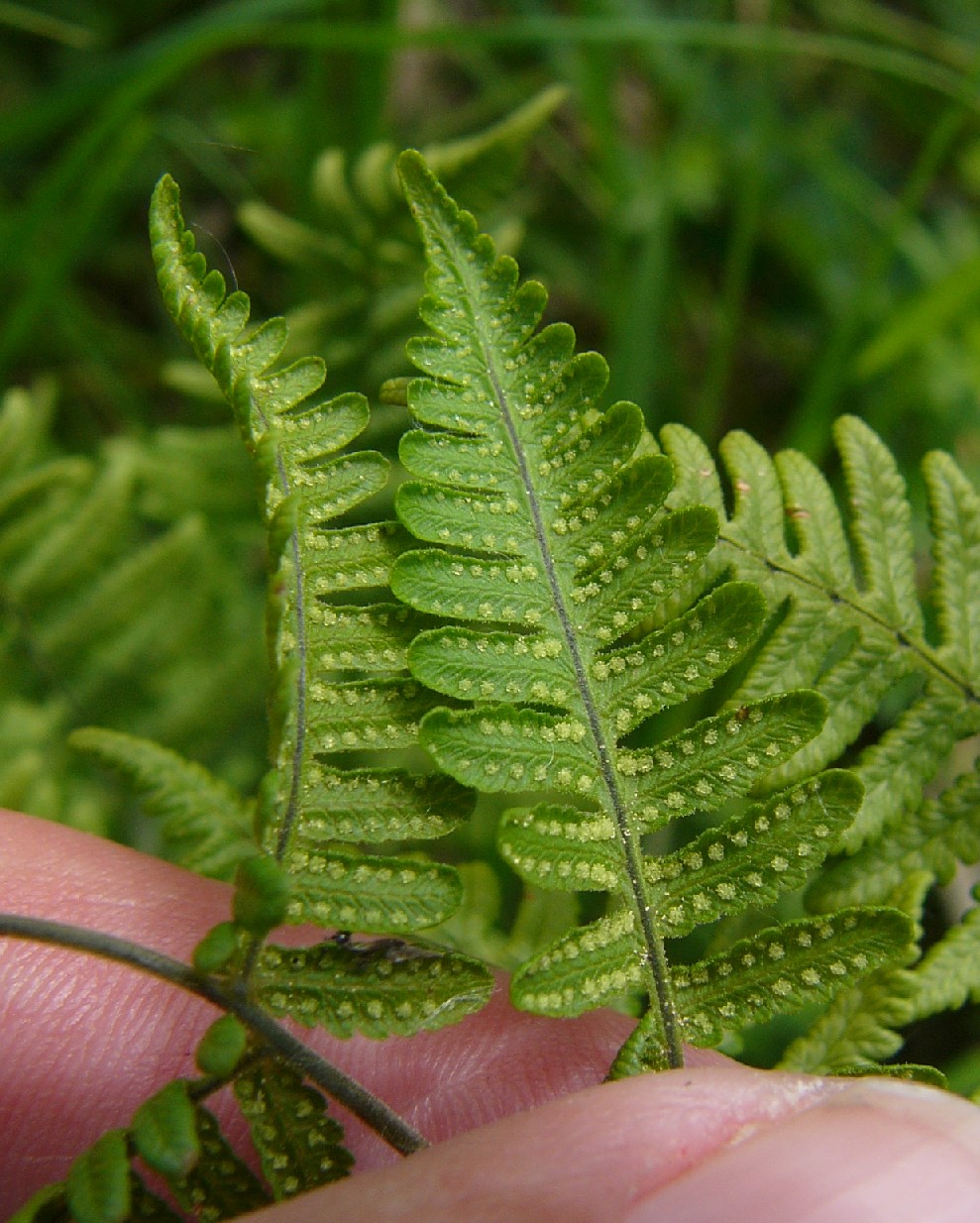 Blattstiel ca. 1,5 mal so lang wie die Spreite Blattspindel dicht drüsig Fiederchen 2. Ordnung schwach gelappt Sori liegen am Ende der Blattnerven, ohne Schleier