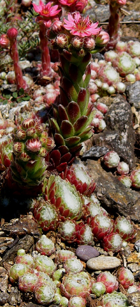 | Blüten mit 6 - 20 Kronblätter Blätter in kugeligen Rosetten > Hauswurz (Sempervivum) |