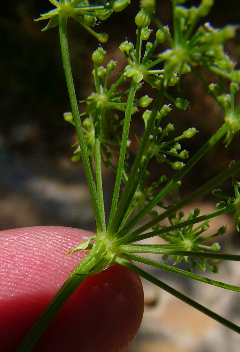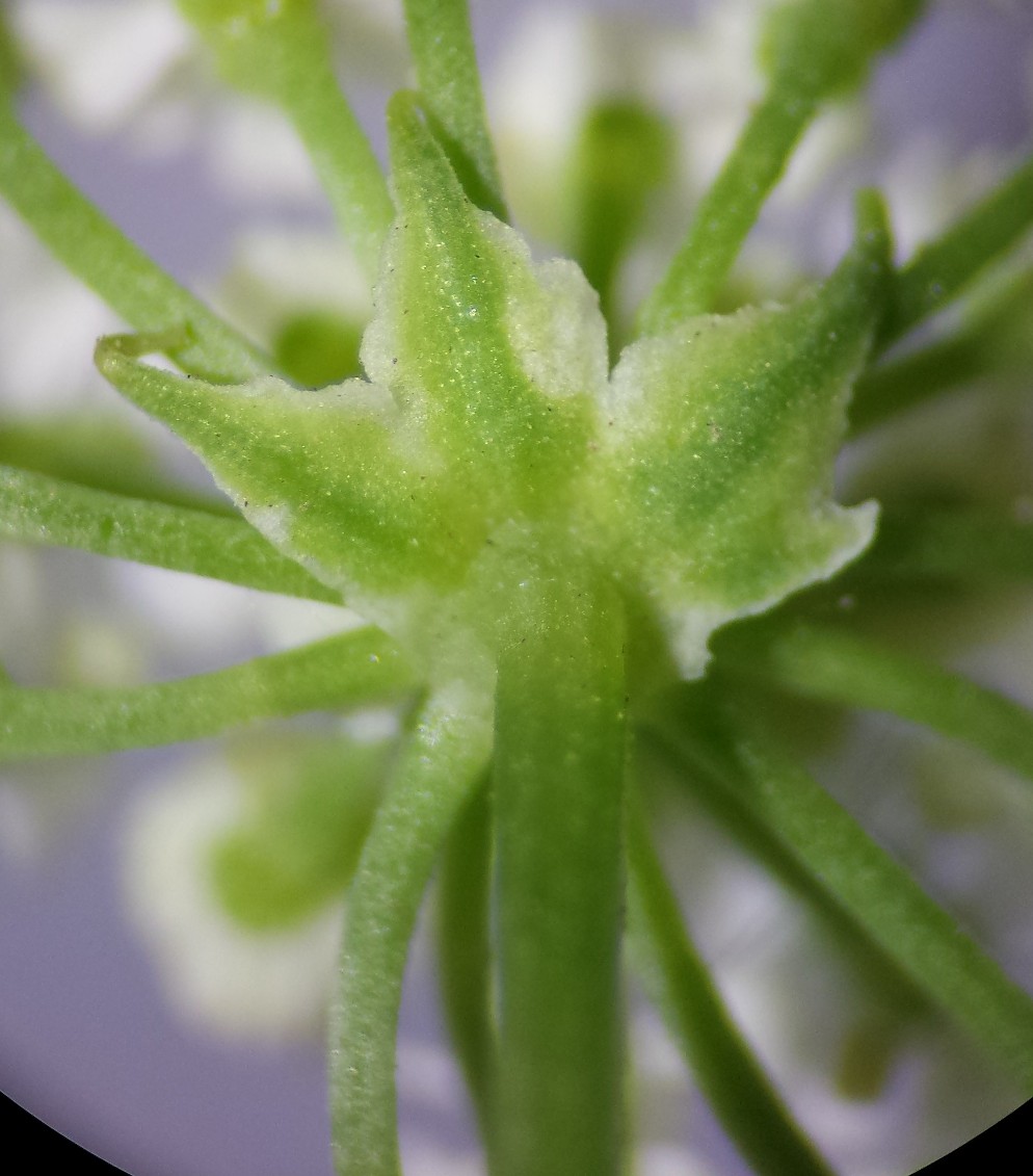 Blüten klein, weiß, Kronblätter der Randblüten nicht vergrößert Dolde mit Hülle Hüllchenblätter dreieckig, im unteren Teil verwachsen