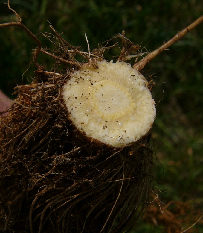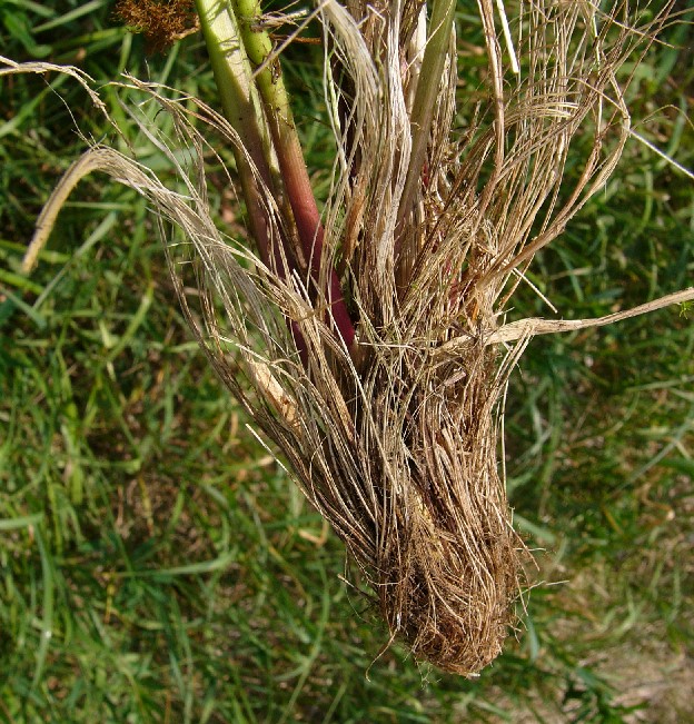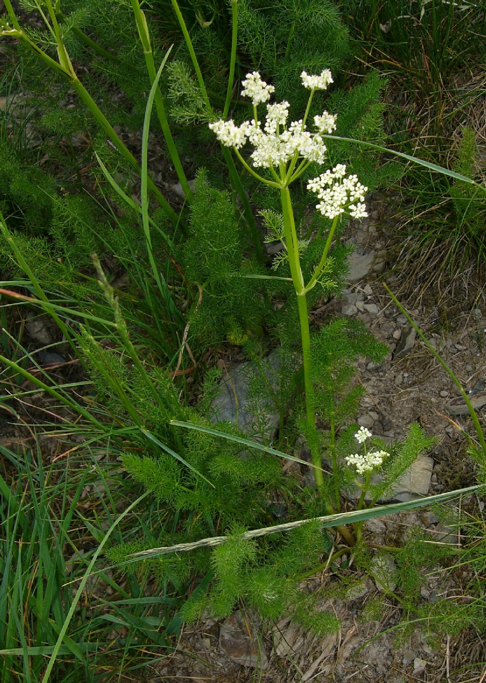 Blattzipfel der Stängelblätter haarfein (0,2 mm) Auch die Grundblätter mit haarfeinen Zipfeln Stängel am Grund mit Faserschopf Die quergeschnittene Wurzel riecht kräftig nach Liebstöckl oder Fenchel