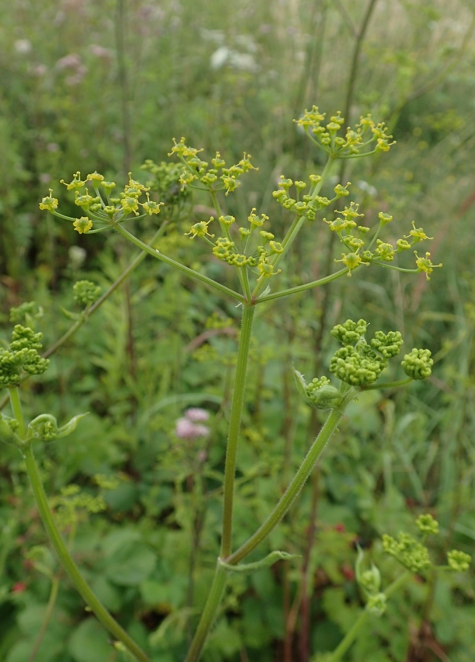 Blüht ab Anfang Juni Dolden 9 - 20- strahlig, längster Doldenstrahl bis 10 cm Pflanze hellgrün oder gelbgrün, Stängel ungleich scharf gerippt > 2
