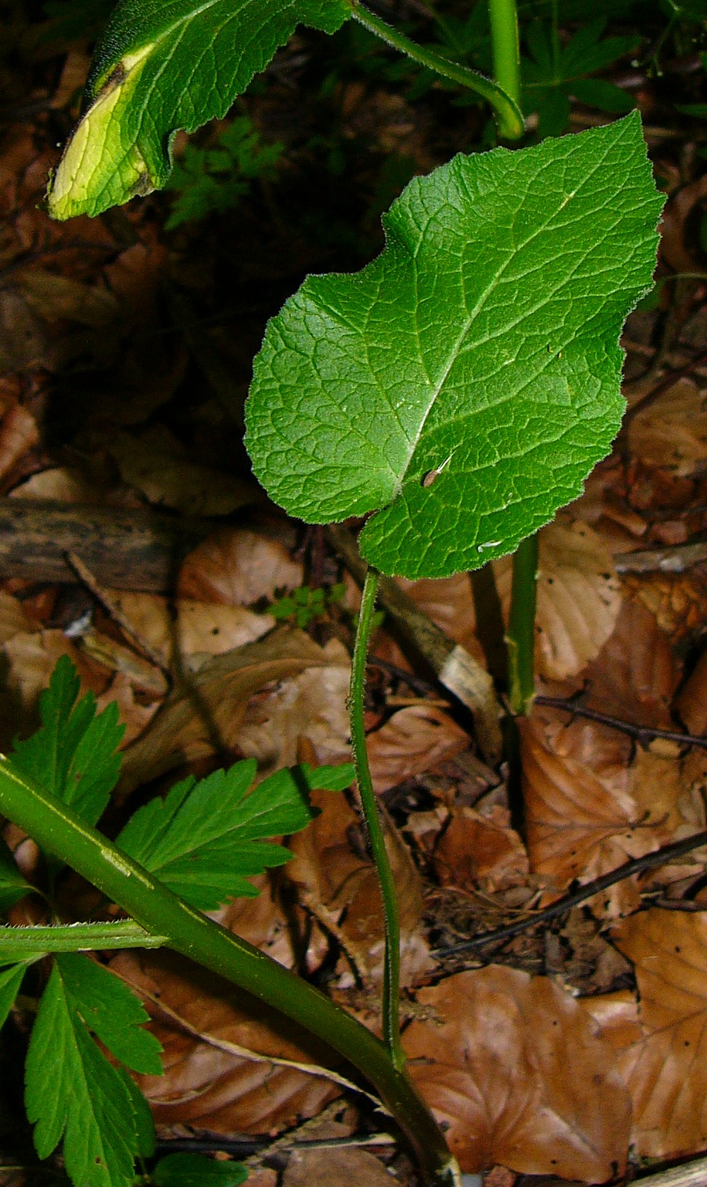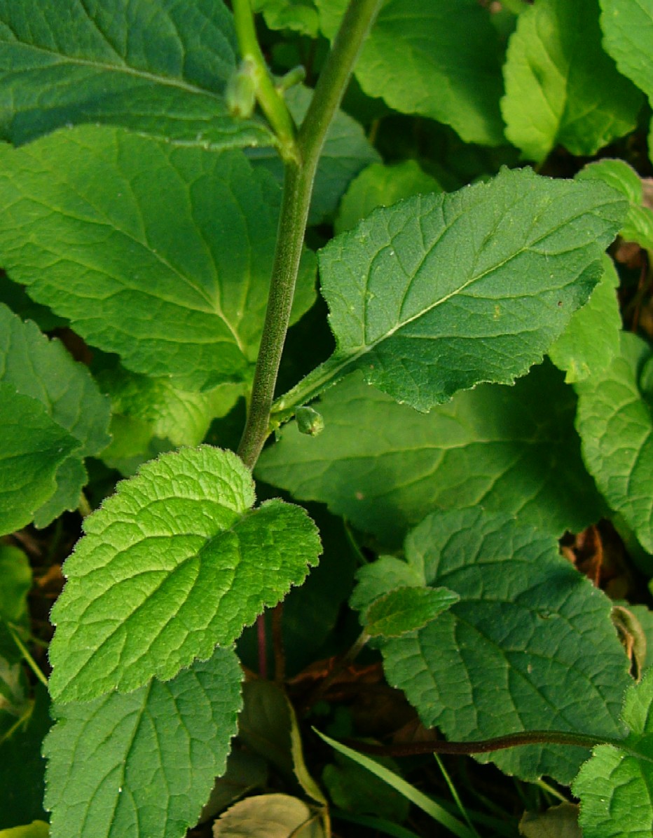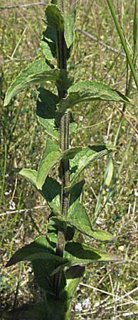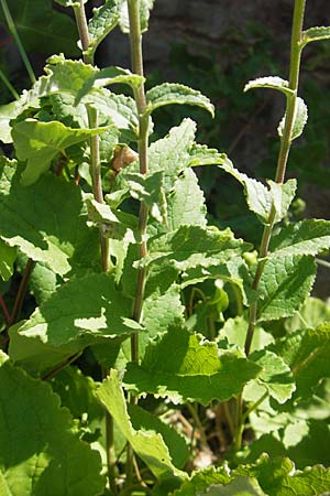 Obere Stängelblätter sitzend, 6 - 15 cm lang beiderseits weichhaarig Mittlere Stängelblätter mit geflügeltem Stiel Untere Stängelblätter stumpf gesägt, lanzettlich bis eiförmig, mit langem Stiel Stängel im unteren Teil meist +/- kahl Grundblätter 2 - 20 cm lang, zur Blütezeit, hinfällig