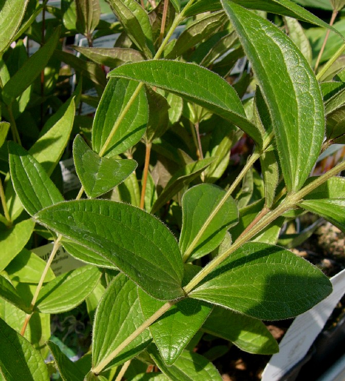 Früchte mit bis zu 5 cm langem, behaartem Griffel Blätter gegenständig, 5 - 14 cm lang, ganzrandig, beiderseits grün, Blätter sitzend, schmal eiförmig bis lanzettlich,