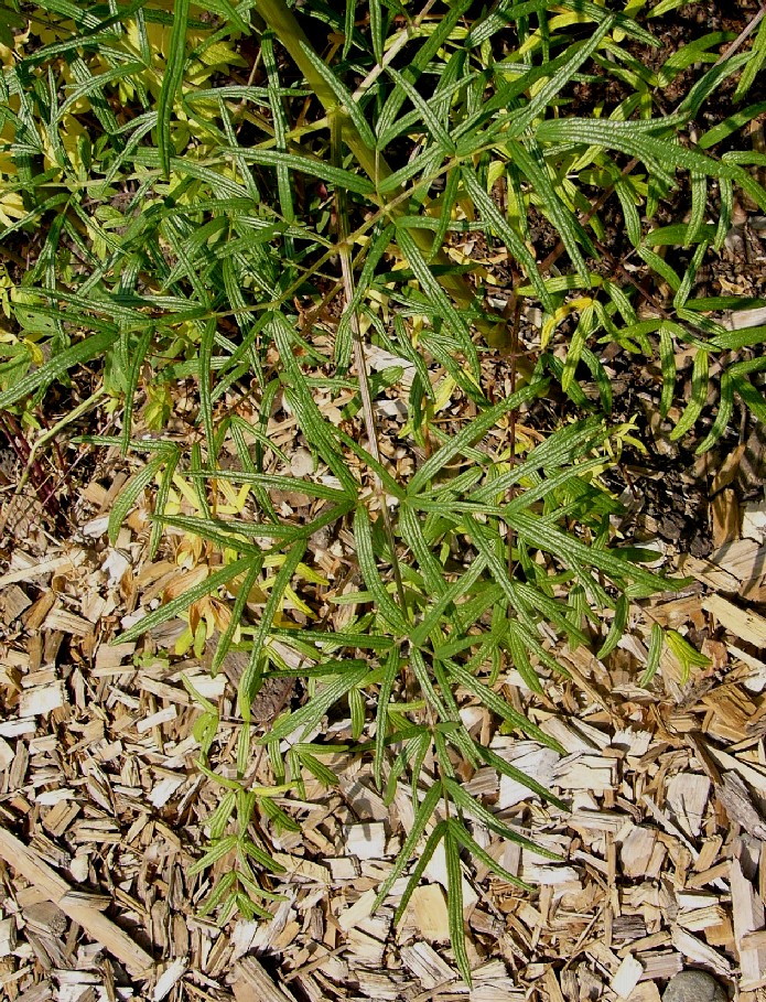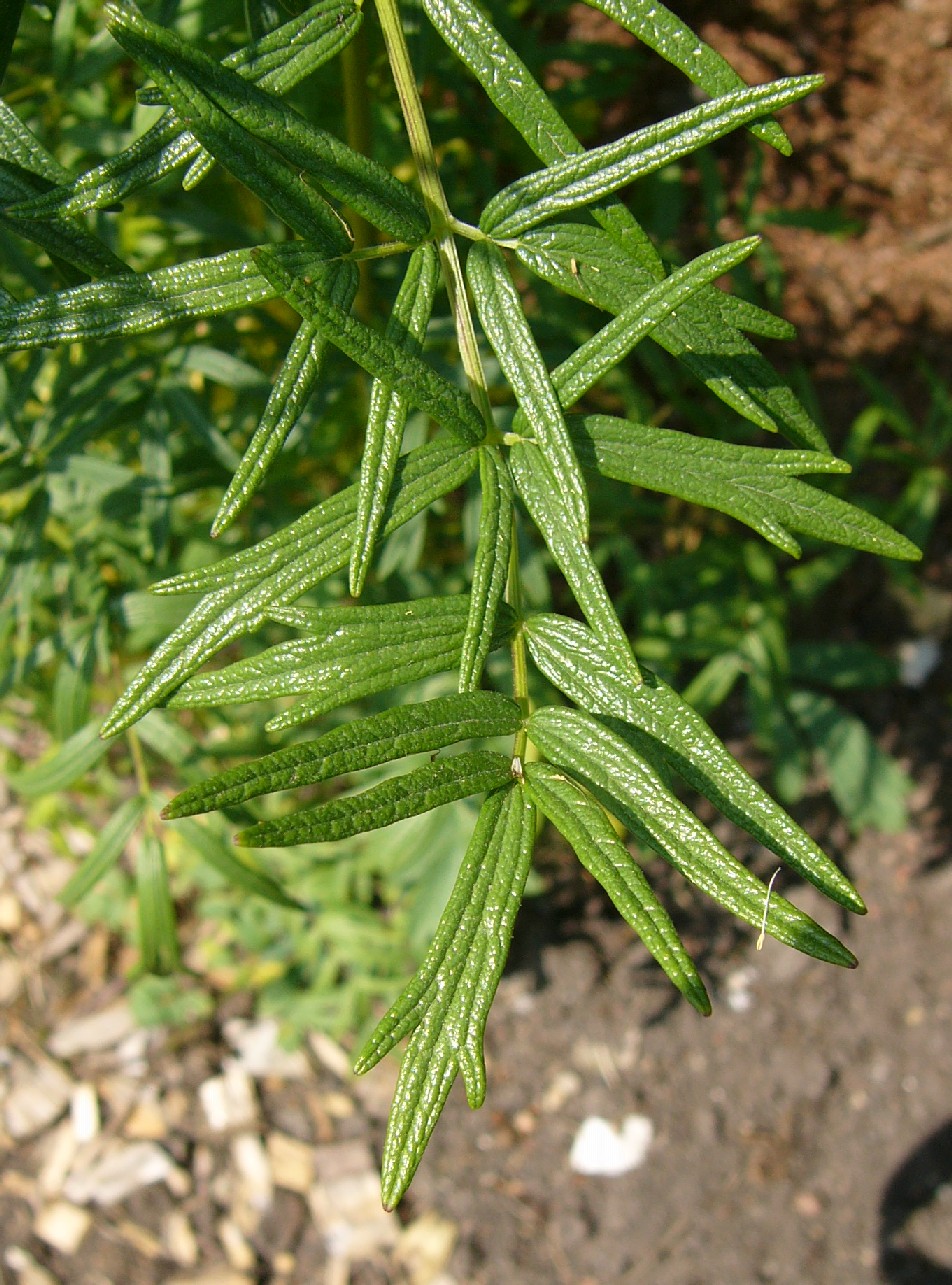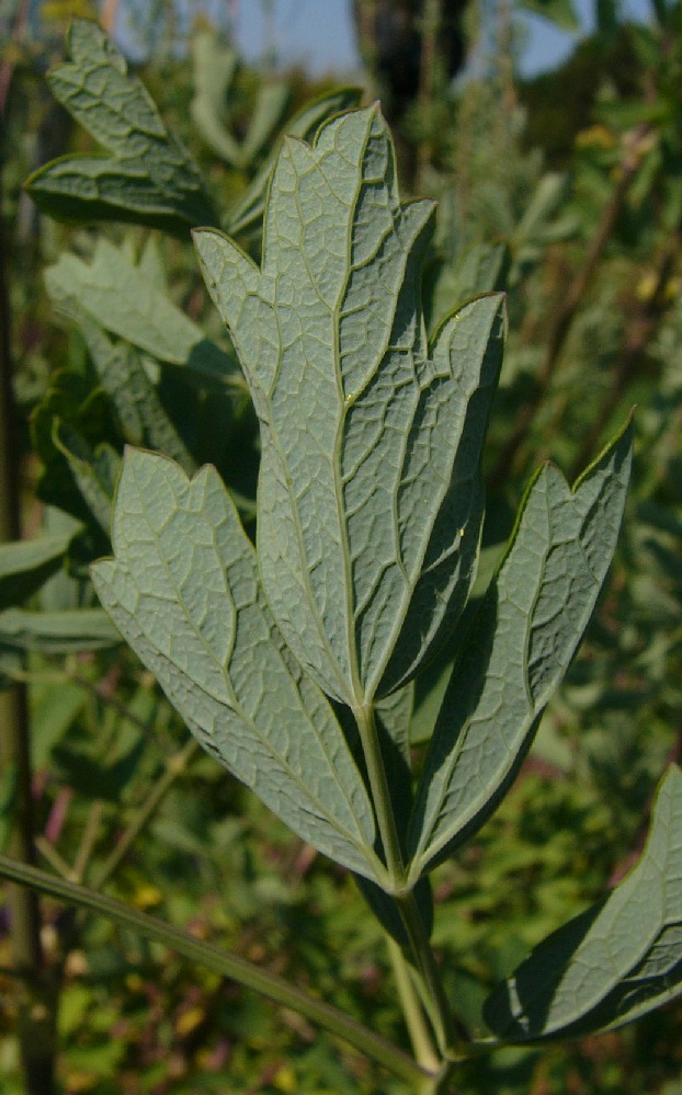 Stängel kantig Blätter blaugrün bis silbrig, gefiedert Fiederblättchen 3 (-5)-spaltig Blattunterseite blaugrün bereift