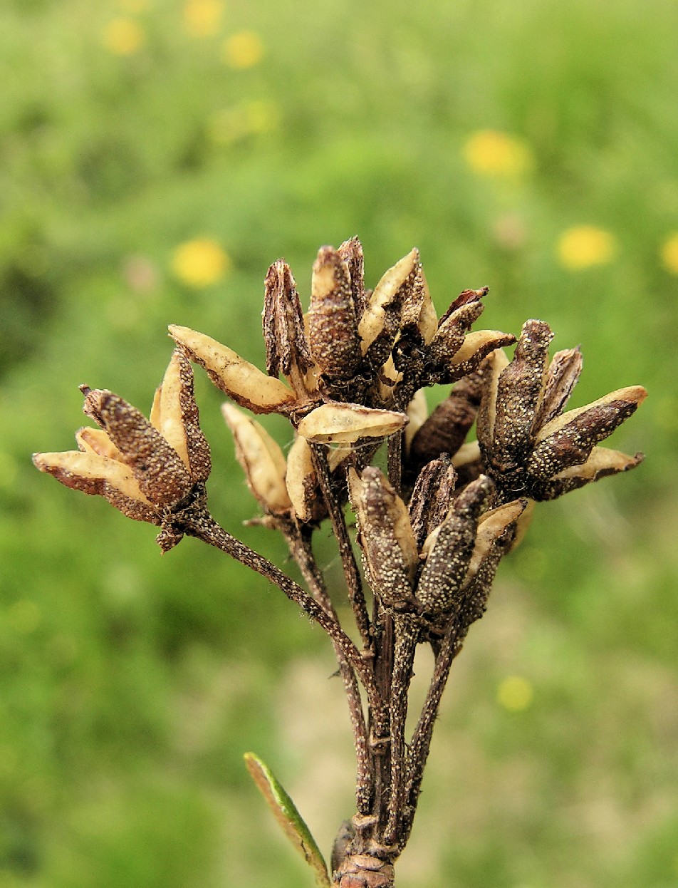Die Früchte öffnen sich 5- zähnig und reifen erst im Jahr nach der Blüte aus Blätter gegenständig, sehr klein, länglich