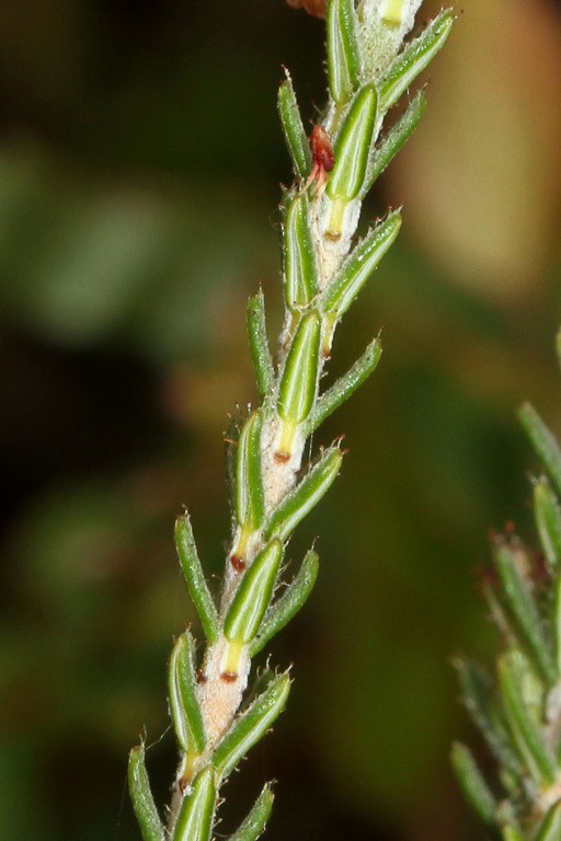 Blätter zu 3 quirlständig, 2 - 7 mm lang, 0,4 mm breit, kahl, umgerollt, Blattunterseite bis auf einen weißen MIttelstreifen vollständig verdeckend, mit einem Büschel achselständiger Blätter