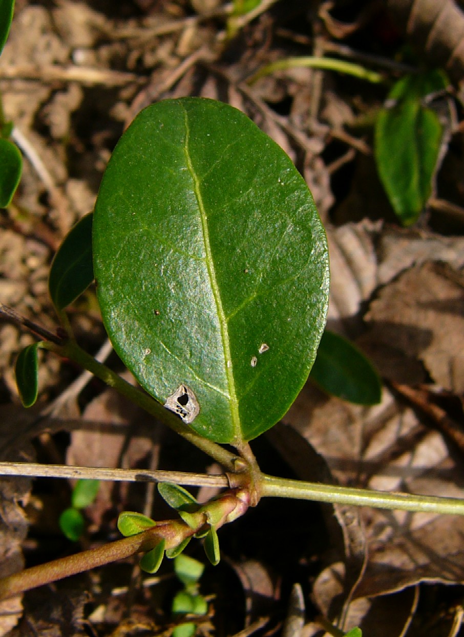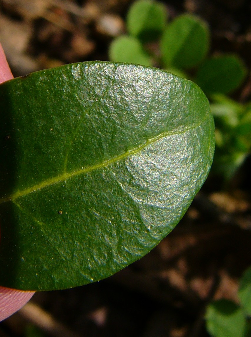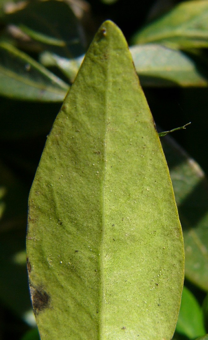 Blätter lanzettlich, 1 - 4 cm lang, am Rand kahl, ledrig, glänzend Blattunterseite gelbgrün, Blattnerven undeutlich