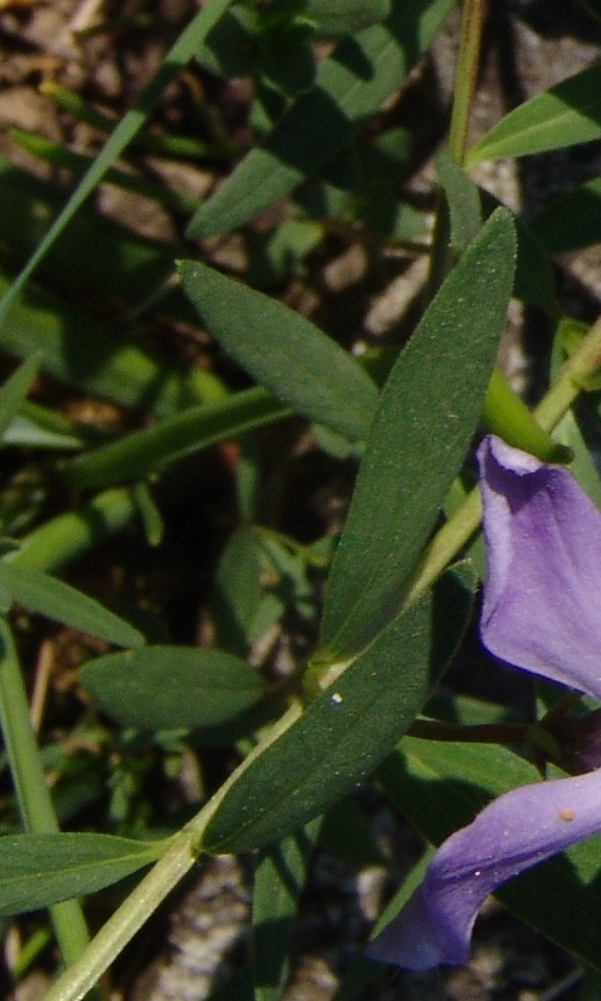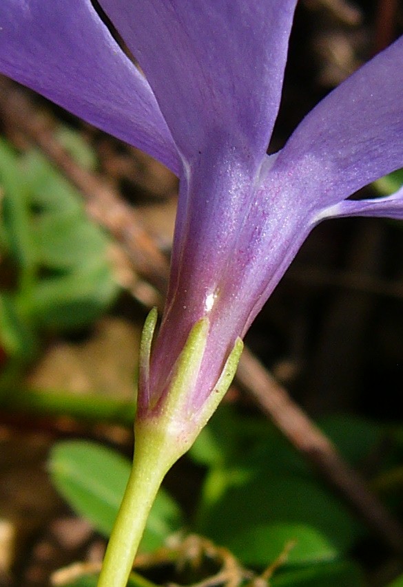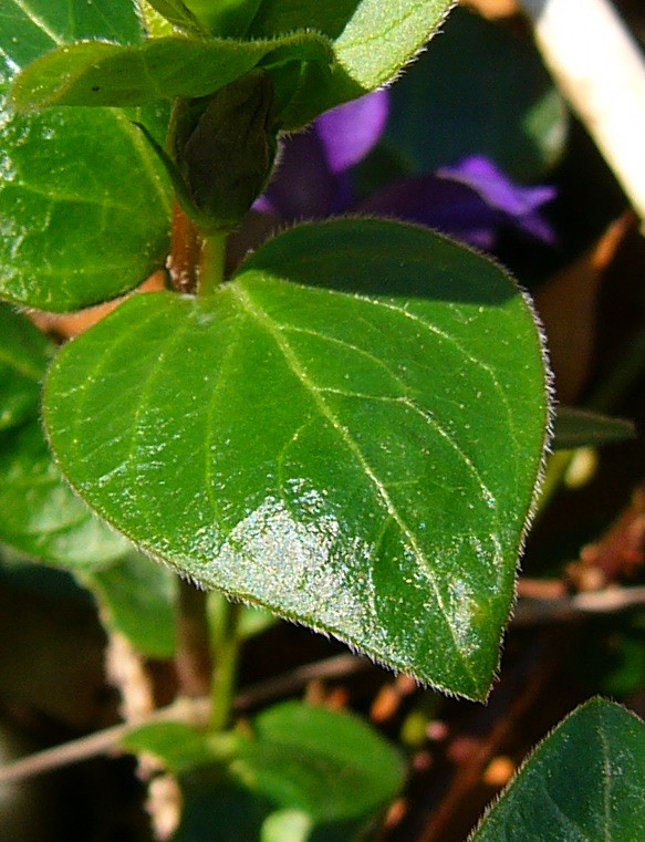 Pflanze 15 - 30 cm groß Blüten dunkelviolett, im Durchmesser 4 - 5 cm Kelchzipfel fädlich, bis 7 - 17 mm lang Blätter 2 - 9 cm, immergrün, oval-lanzettlich, mit herzförmiger Basis, < 2mal so lang wie breit Blätter am Rand bewimpert