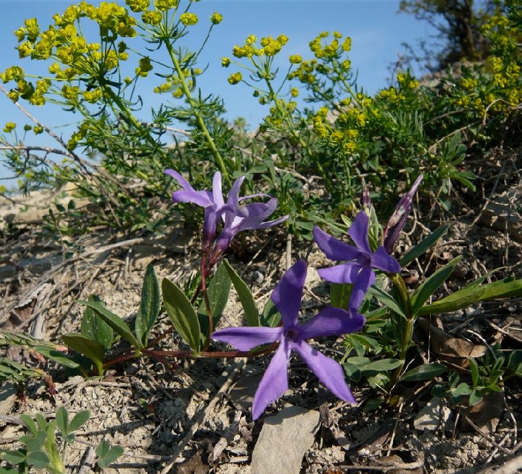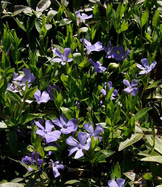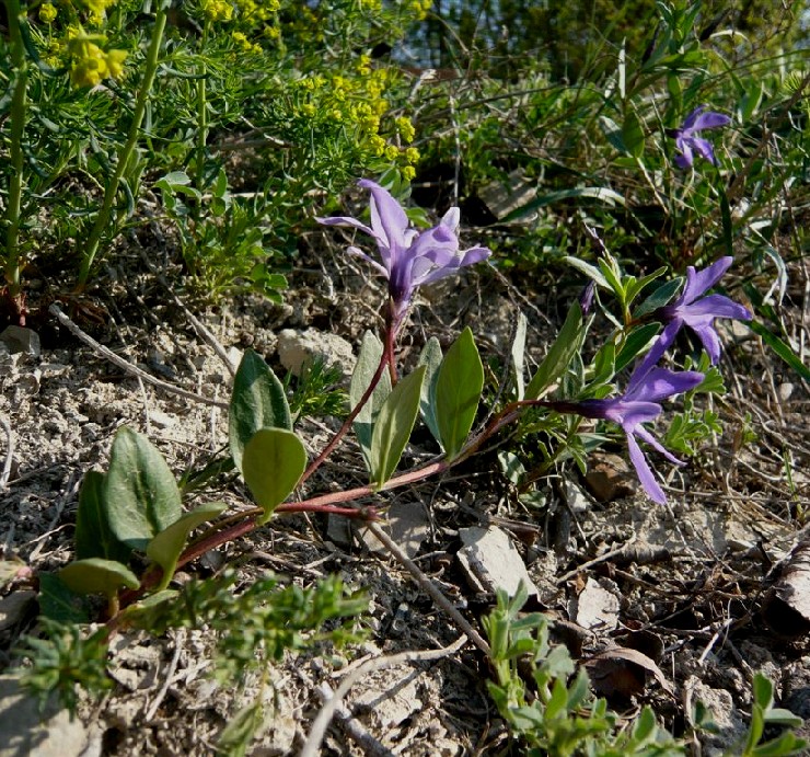 Pflanze 10 - 20 cm, immergrün, verholzend, als Bodendecker eingesetzt Bogenausläufer bis 60 cm lang, Blüten hellblau, hellviolett, selten weiß Kelchzipfel bis 2 - 5 mm lang Aus der befruchteten Blüte entwickeln sich 2 Balgfrüchte, die 35 bis 40 mm lang sind