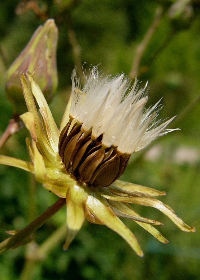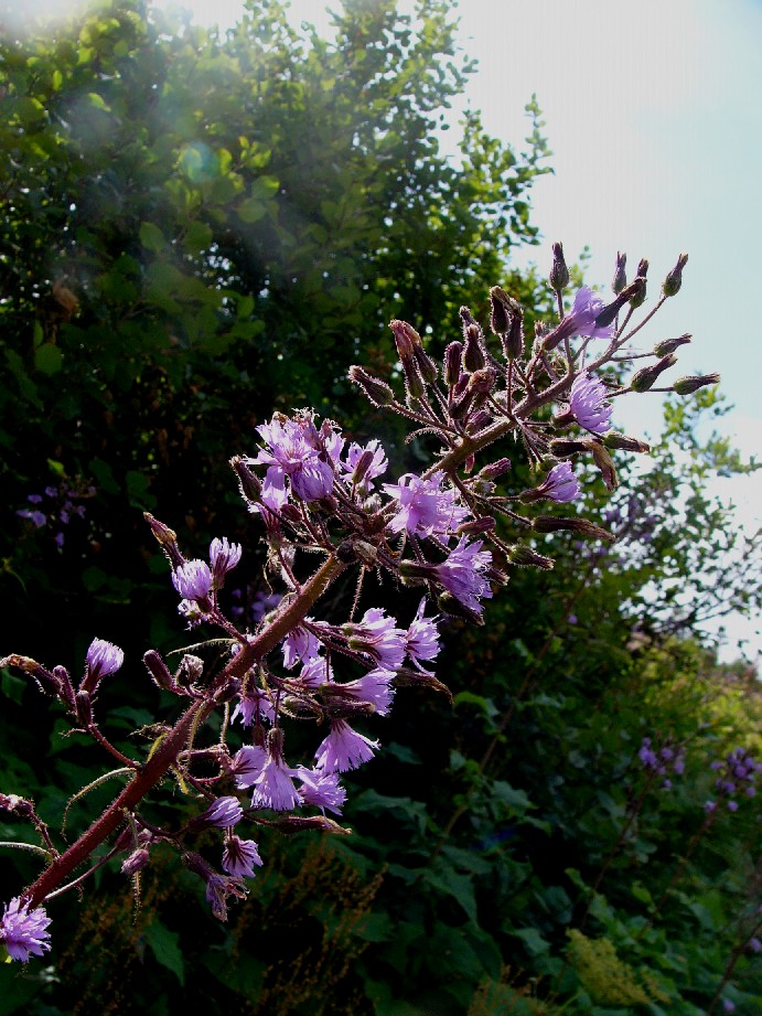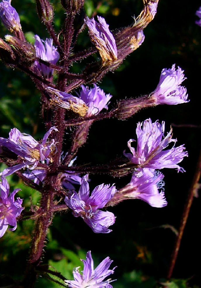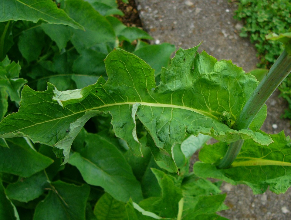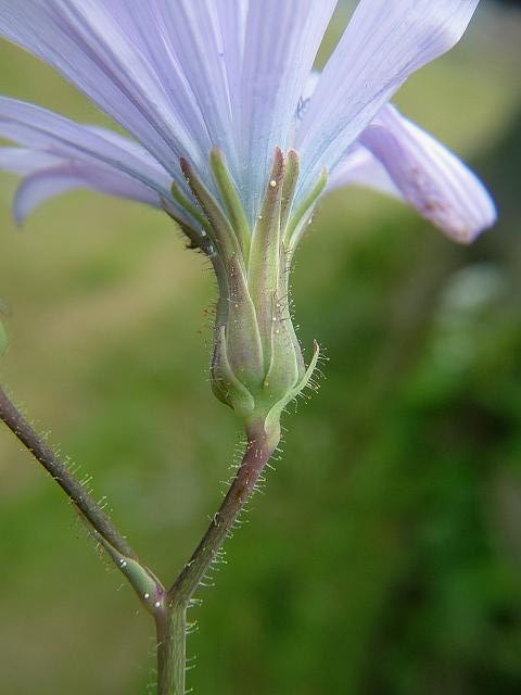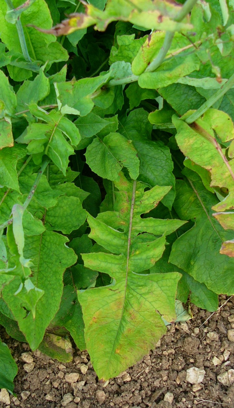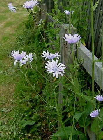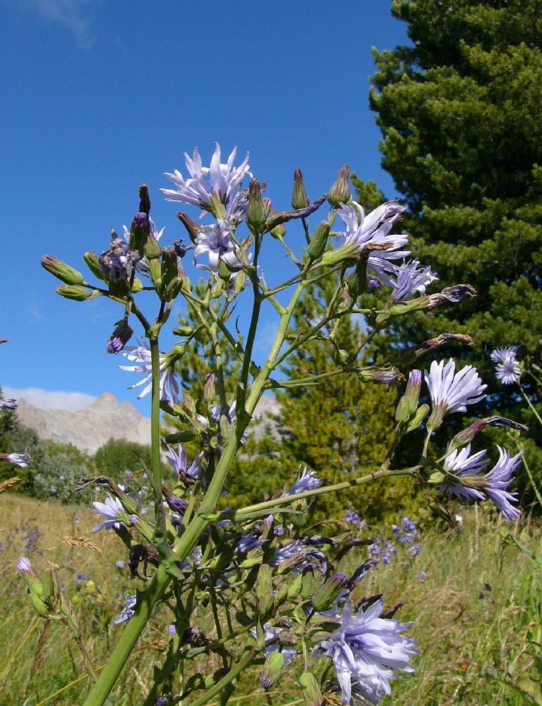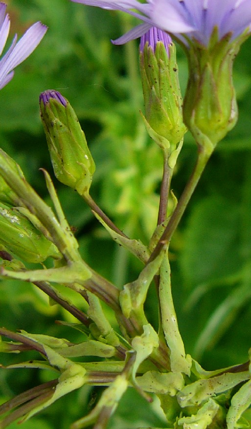 Pflanze 60 - 130 cm groß Köpfchenstand rispig doldig oder rispig Blüten hellblau Hüllblätter kahl Früchte ohne Schabel, Pappus weiß Pflanze oberwärts kahl Obere Blätter länglich, buchtig, stängelumfassend Untere Blätter schrotsägeförmig fiederteilig, mit großem eilänglichem Endabschnitt, herzförmig stängelumfassend Blattunterseite blaugrün, +/- kahl