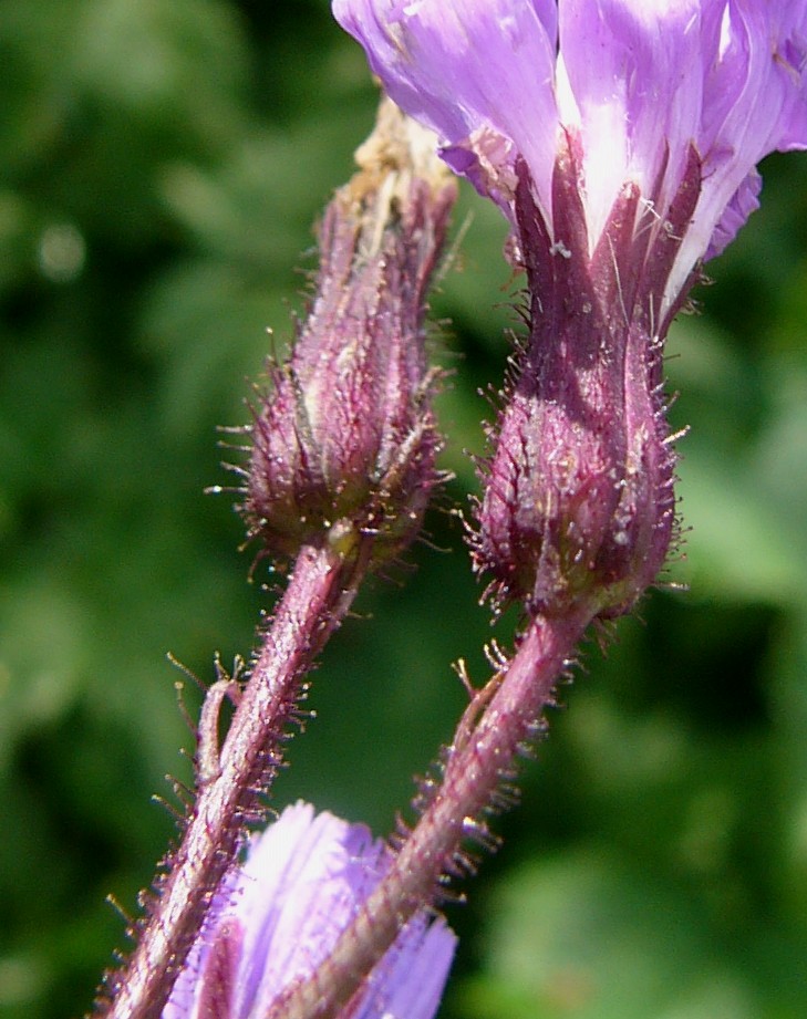 Pflanze 60 - 200 cm groß Blütenstand rispig Blüten dunkel blauviolett, nur Zungenblüten Hüllblätter und Blütenstand drüsig behaart Früchte 5 mm lang, ohne Rand, jederseits 5 – 11nervig Pflanze oberwärts stark drüsig behaart Untere Blätter mit 3 Paar Seitenzipfeln, Endabschnitt dreieckig spießförmig Obere Stängelblätter mit spitzen Zipfeln stängelumfassend