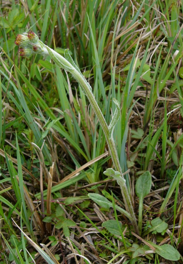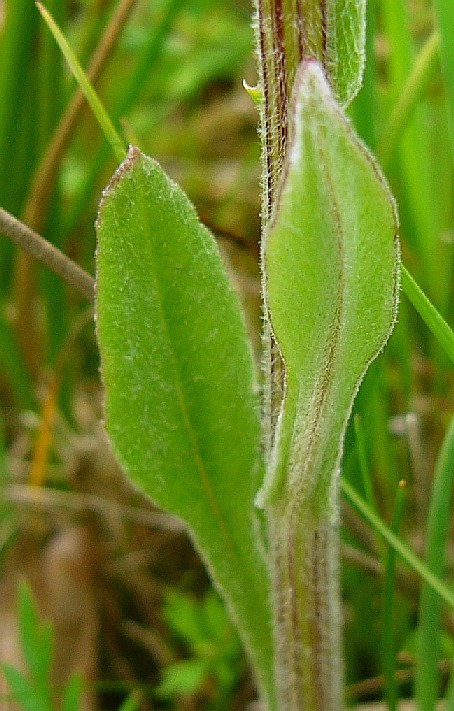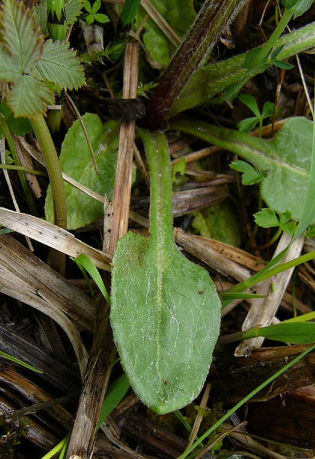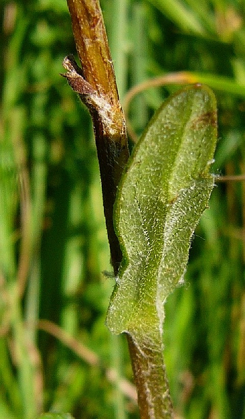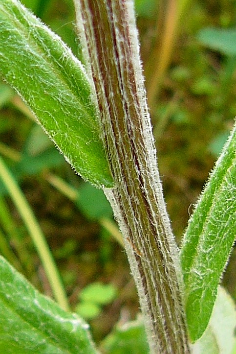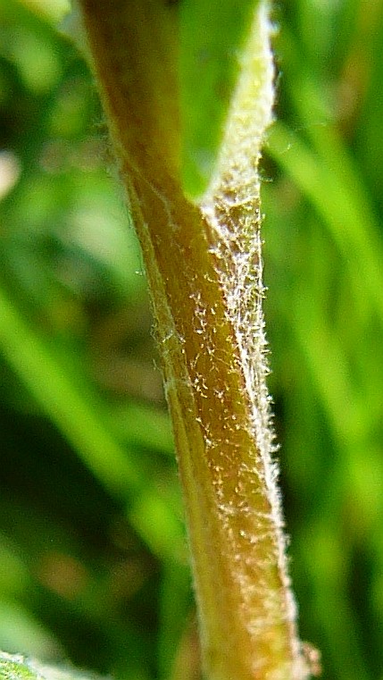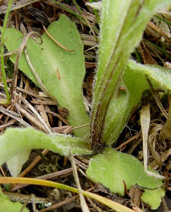 Stängel spinnwebig behaart Stängelblätter beiderseits +/- spinnwebig behaart, Grundblätter flach dem Boden anliegend, spatelförmig, mit breit geflügeltem Stiel, Stiel meist viel kürzer wie die Spreite
