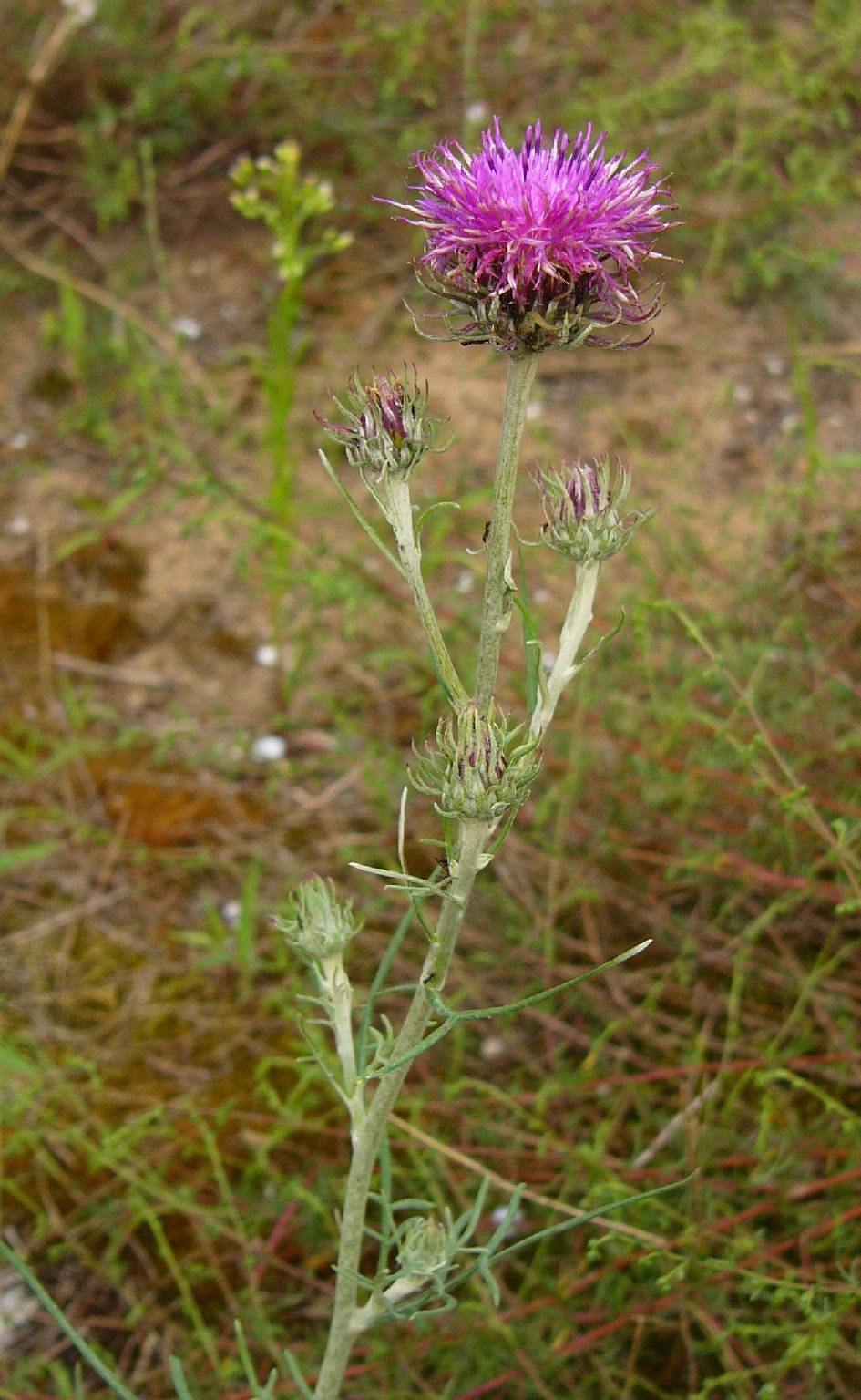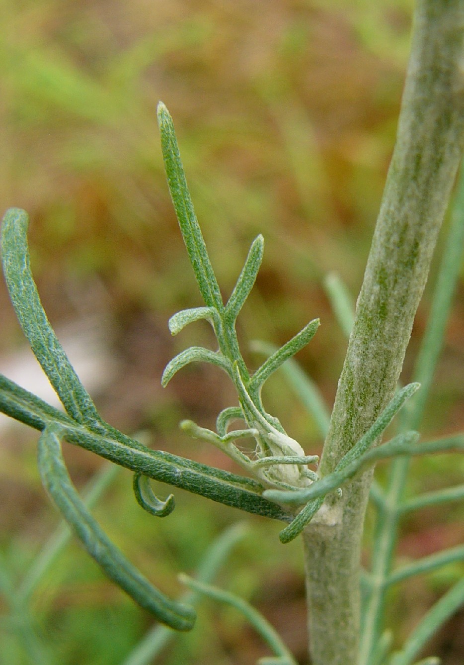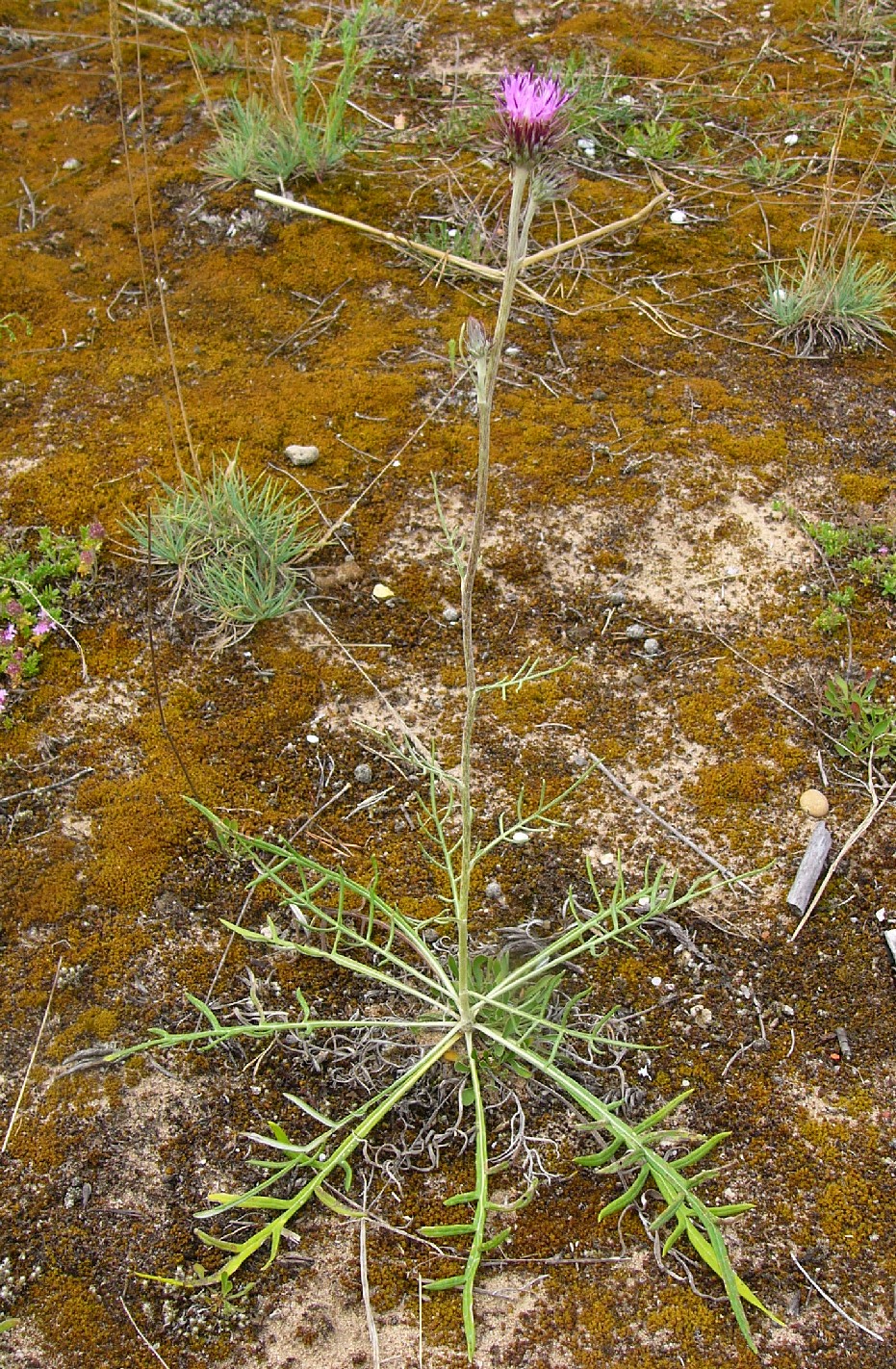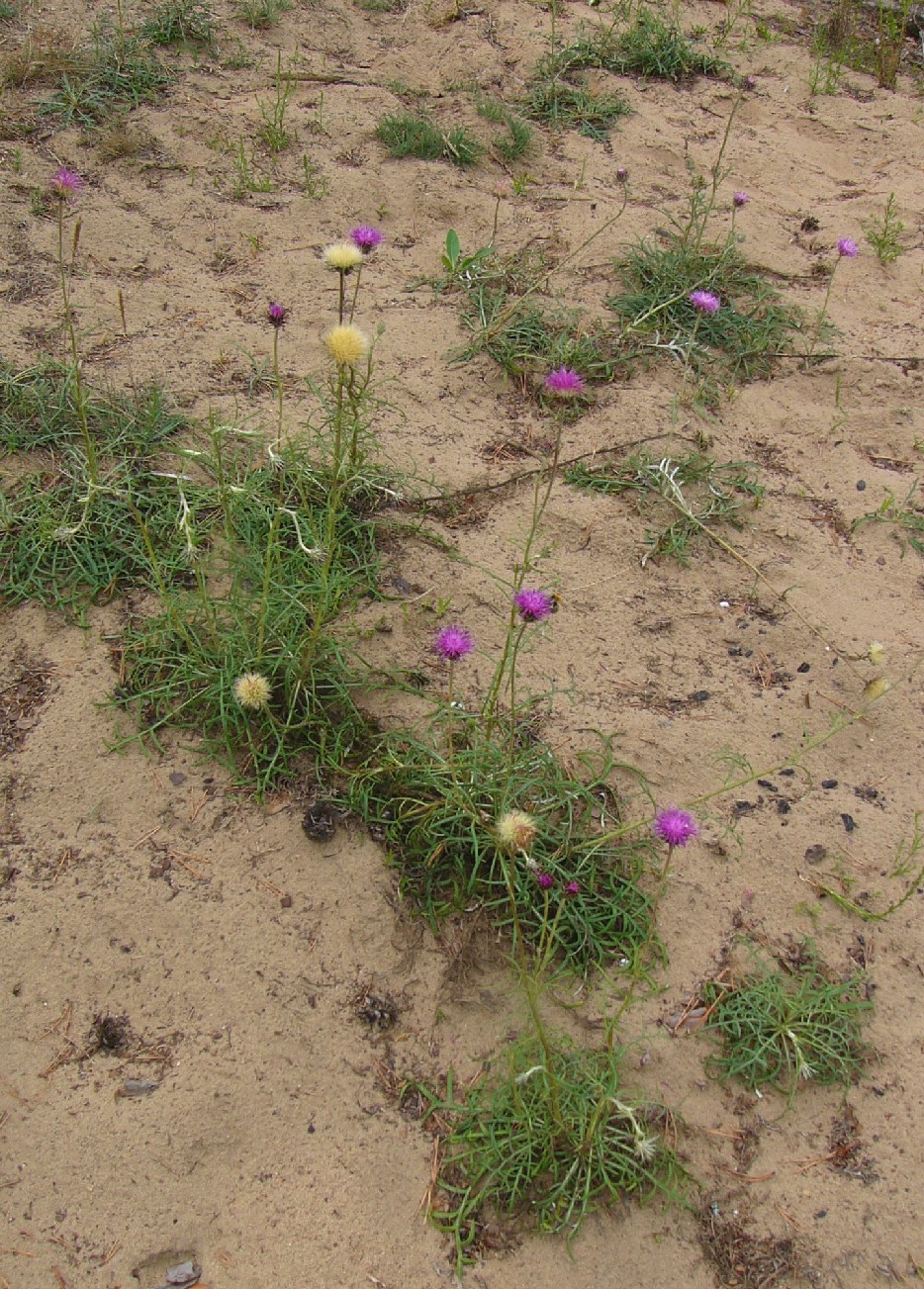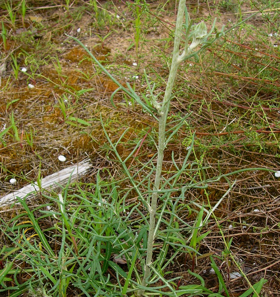 Hüllblätter mehrreihig, lockerstehend, schmal- linear, spitz, ohne Anhängsel, Früchte 4 - 5 mm lang, gerippt, fein warzig, kahl mit mehrreihigem, rauen, nicht gefiederten Pappushaaren, die 3 - 2,5 mal so lang wie die Früchte sind Stängel flockig weißfilzig, , beblättert Stängelblätter 1- 2-fach fiederteilig, mit 1 mm