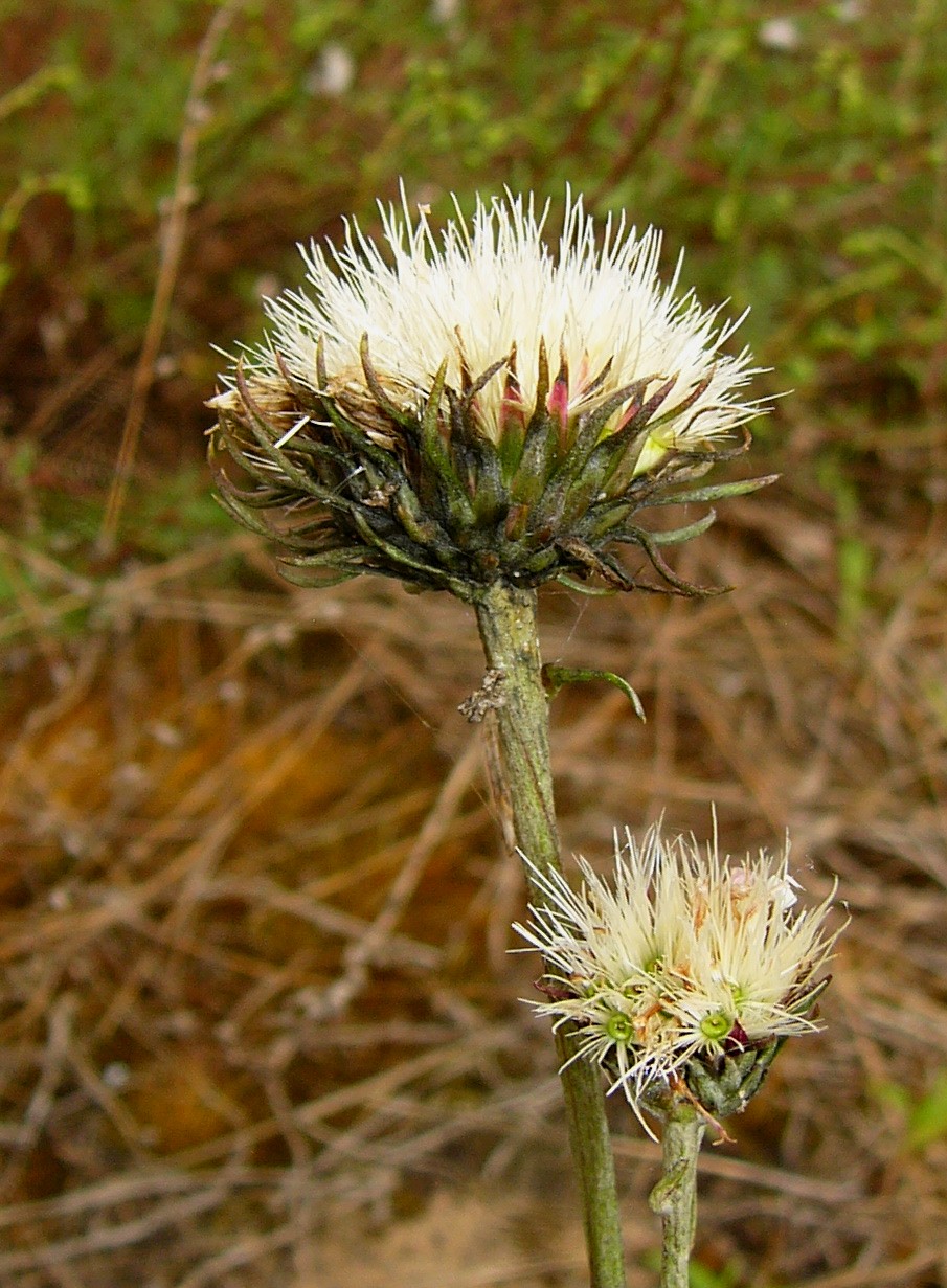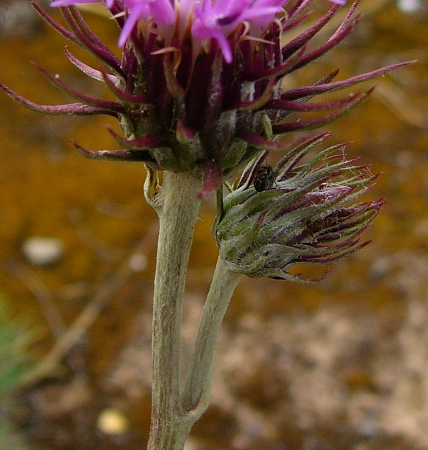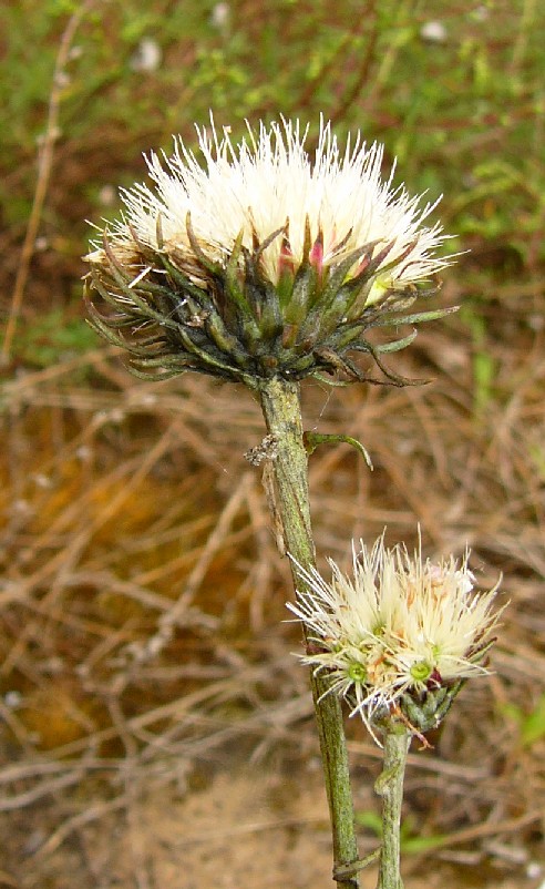 2 Köpfchen schlank eiförmig, mit anliegenden Hüllblättern, Pappus braun, borstig
