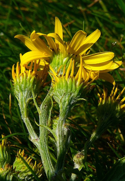 Köpfchen 25 - 40 mm im Durchmesser, mit 13 - 21 Zungenblüten Hülle 6 - 8 mm lang, spinnwebig behaart,