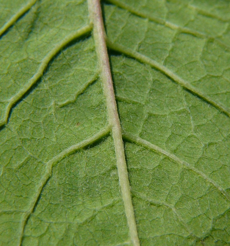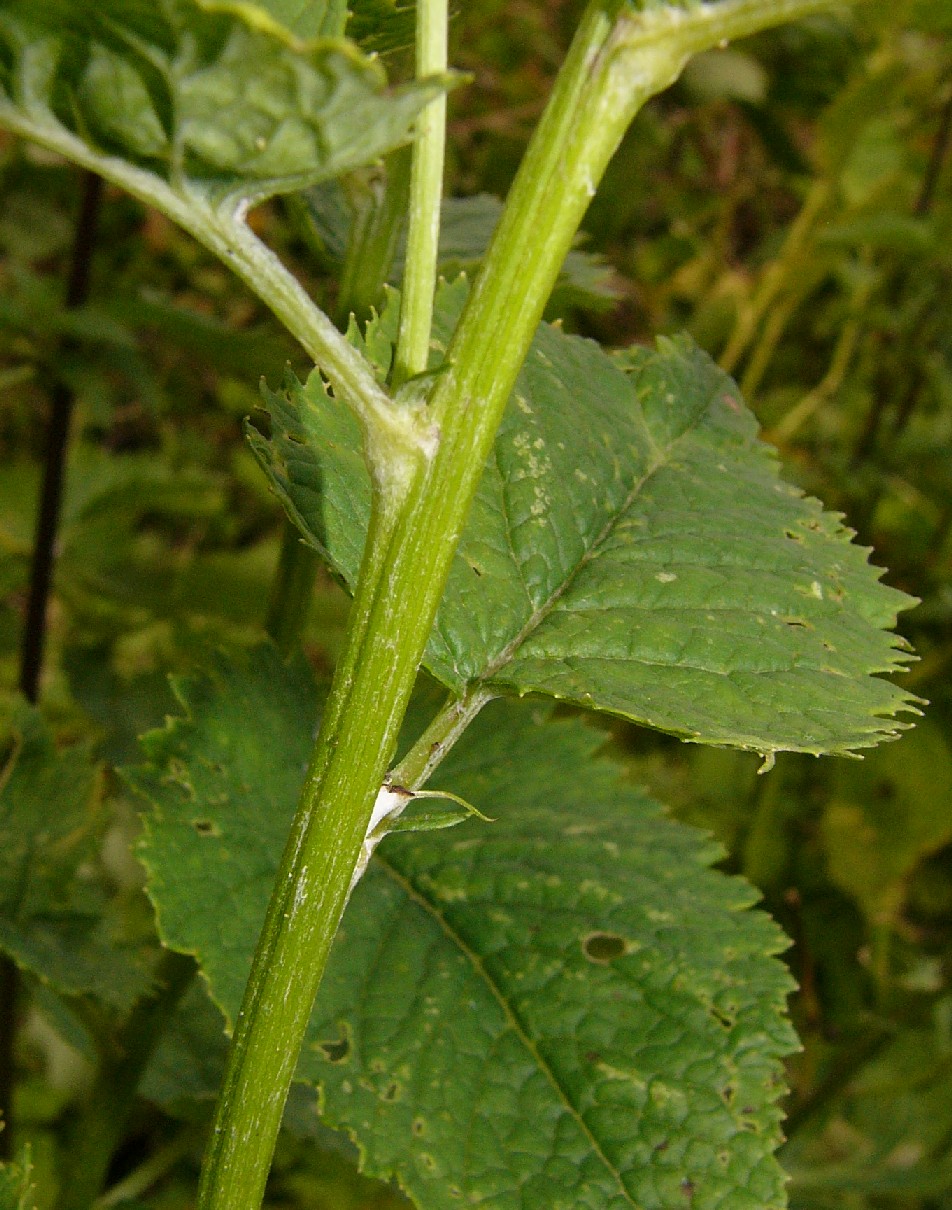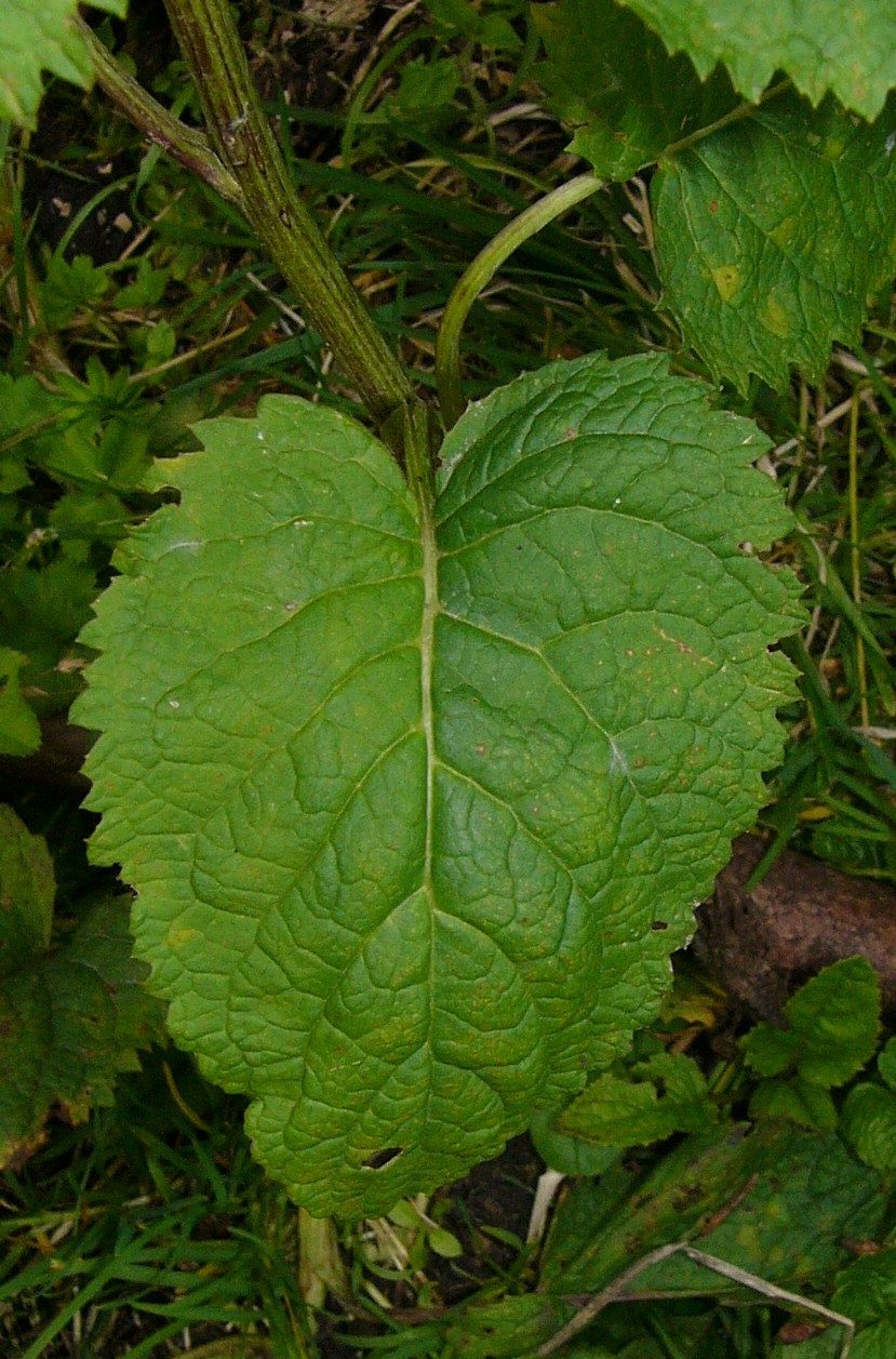 Stängel kantig, gerillt, Blätter 5 - 15 cm lang, 3 - 10 cm breit, etwa 1,5 mal so lang wie breit, eiförmig, scharf gesägt, am Grund herzförmig, oberseits kahl Blätter unterseits schwach spinnwebig behaart, verkahlend Grundblätter lang gestielt, Stiel ungeflügelt