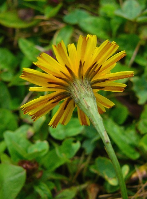 Krone goldgelb Stiele nach oben wenig verdickt, Randblüten unterseits gelb, Korbhals mit 3 - 6 Hochblättern Pappus schmutzigweiß, zweireihig: außen borstig, innen fedrig Grundblätter buchtig gezähnt bis fast ganzrandig, kahl oder mit wenigen einfachen Haaren, deutlich gestielt