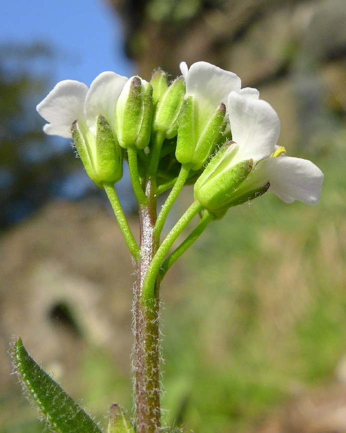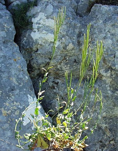 Grundblattrosette zu Blütezeit meist verwelkt Reife Schoten abstehend > Reife Schoten abstehend |