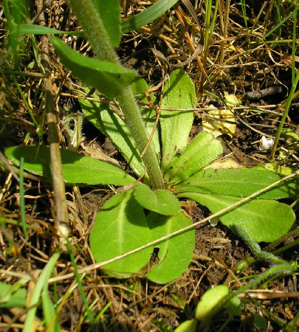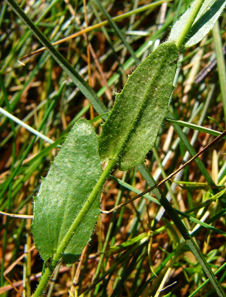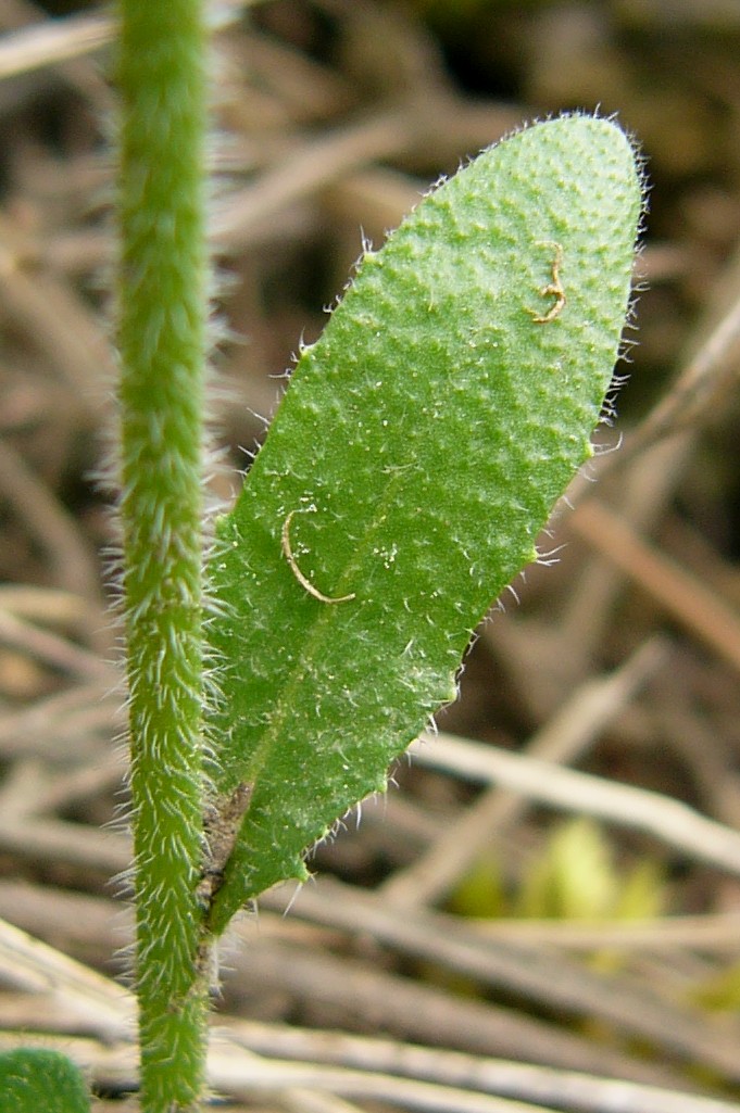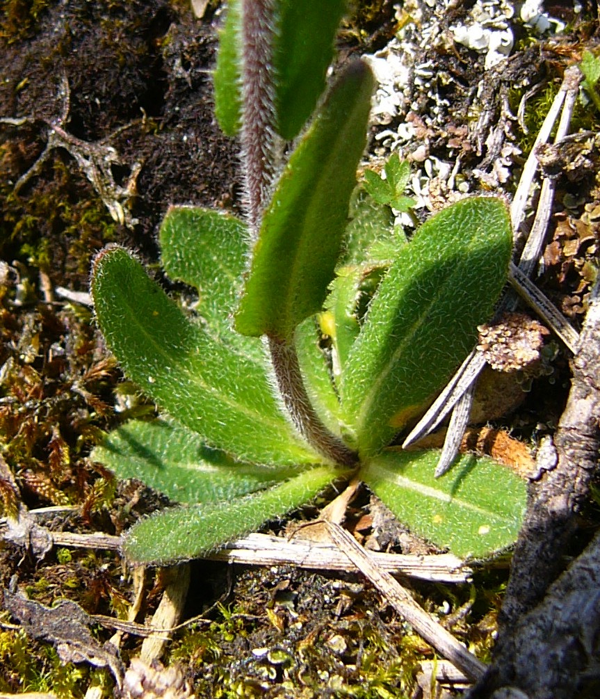 wesentlich länger als ihr Stiel Stängel oben kahl, am Grund angedrückt behaart Blätter sich überlappend, dem Stängel anliegend, Grundblätter bis 85 mm lang, 25 mm breit, rosettig, spatelförmig, zur Blütezeit vorhanden