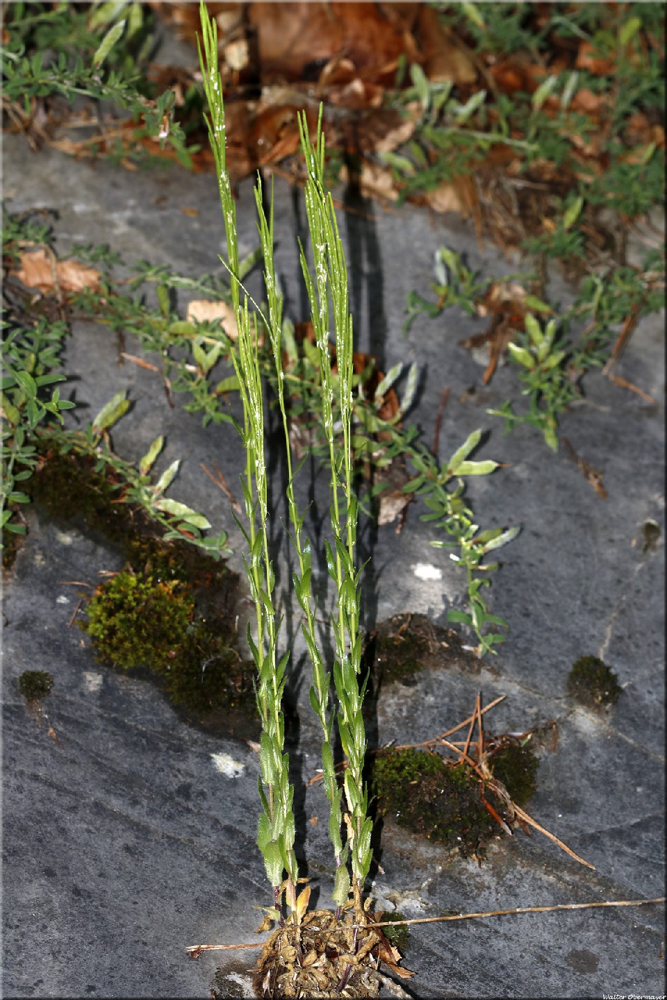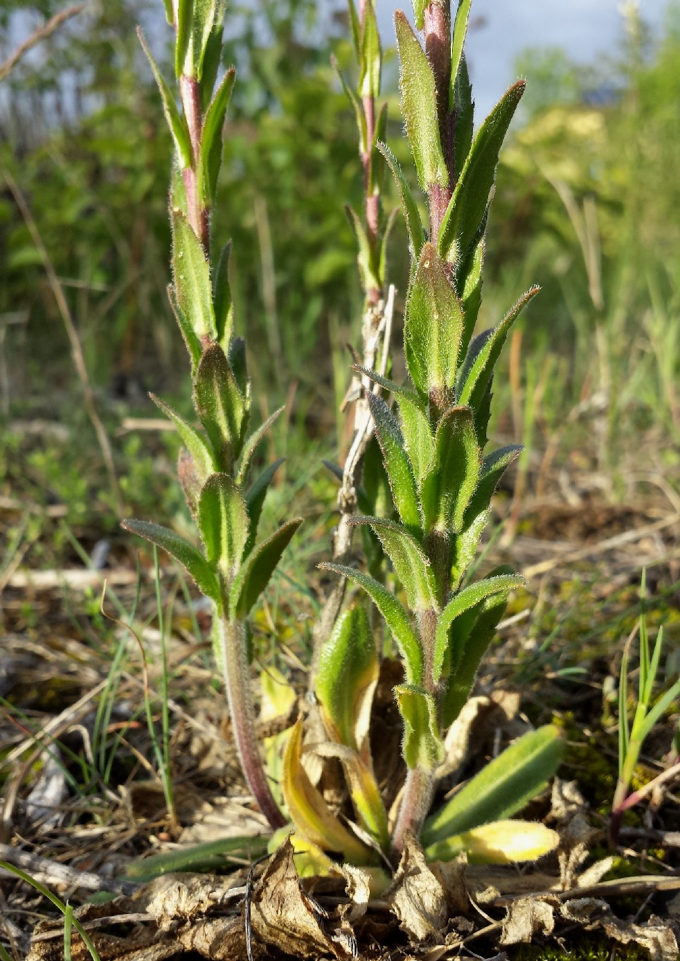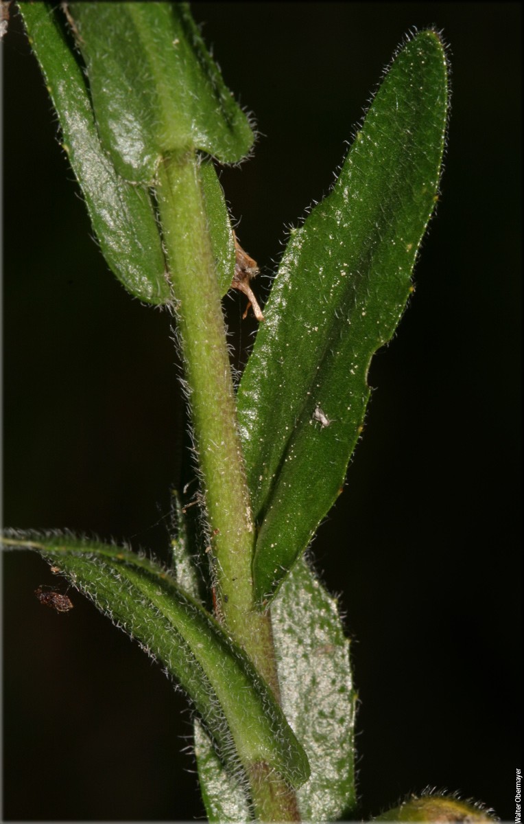 Schoten dicht stehend, steif aufrecht, streng parallel zum Stängel, Stängel abstehend behaart