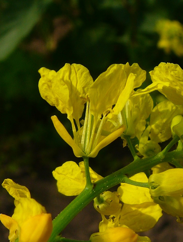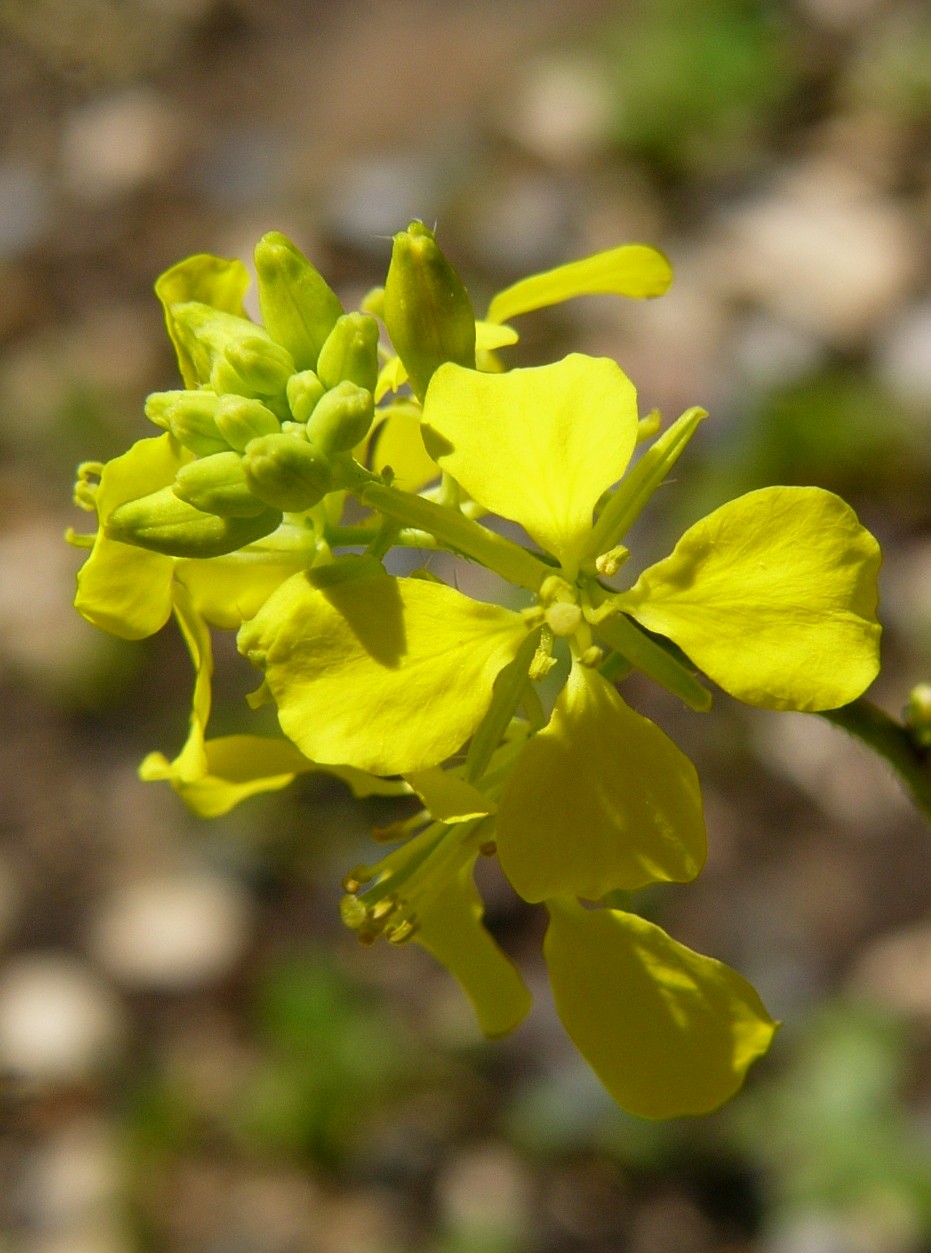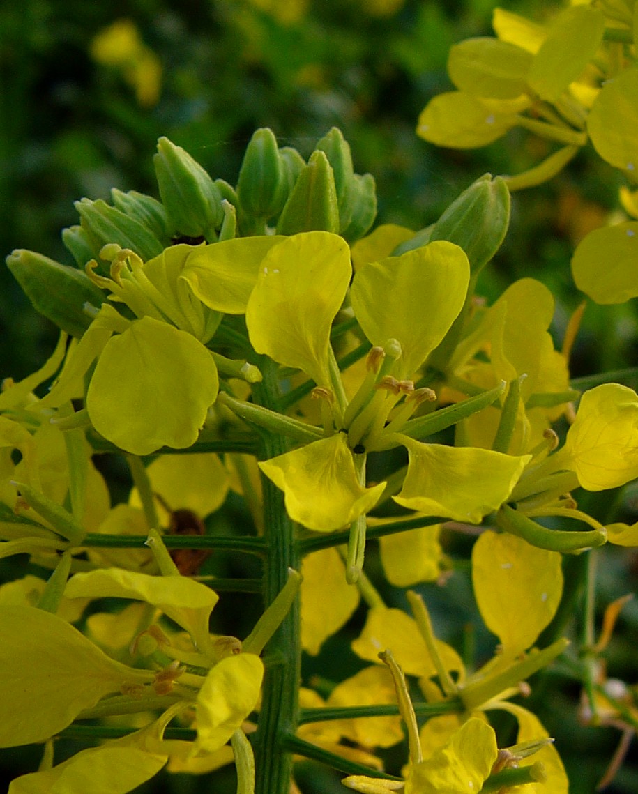 Pflanze 40 - 120 cm groß Kronblätter gelb, in doldigen Trauben Kelchblätter weit abstehend Kronblätter lang genagelt, Narbe kopfig Stängel kantig Reife Schoten enthalten 4 - 8 hellgelbe Samen Stängel kahl oder mit einigen langen Haaren