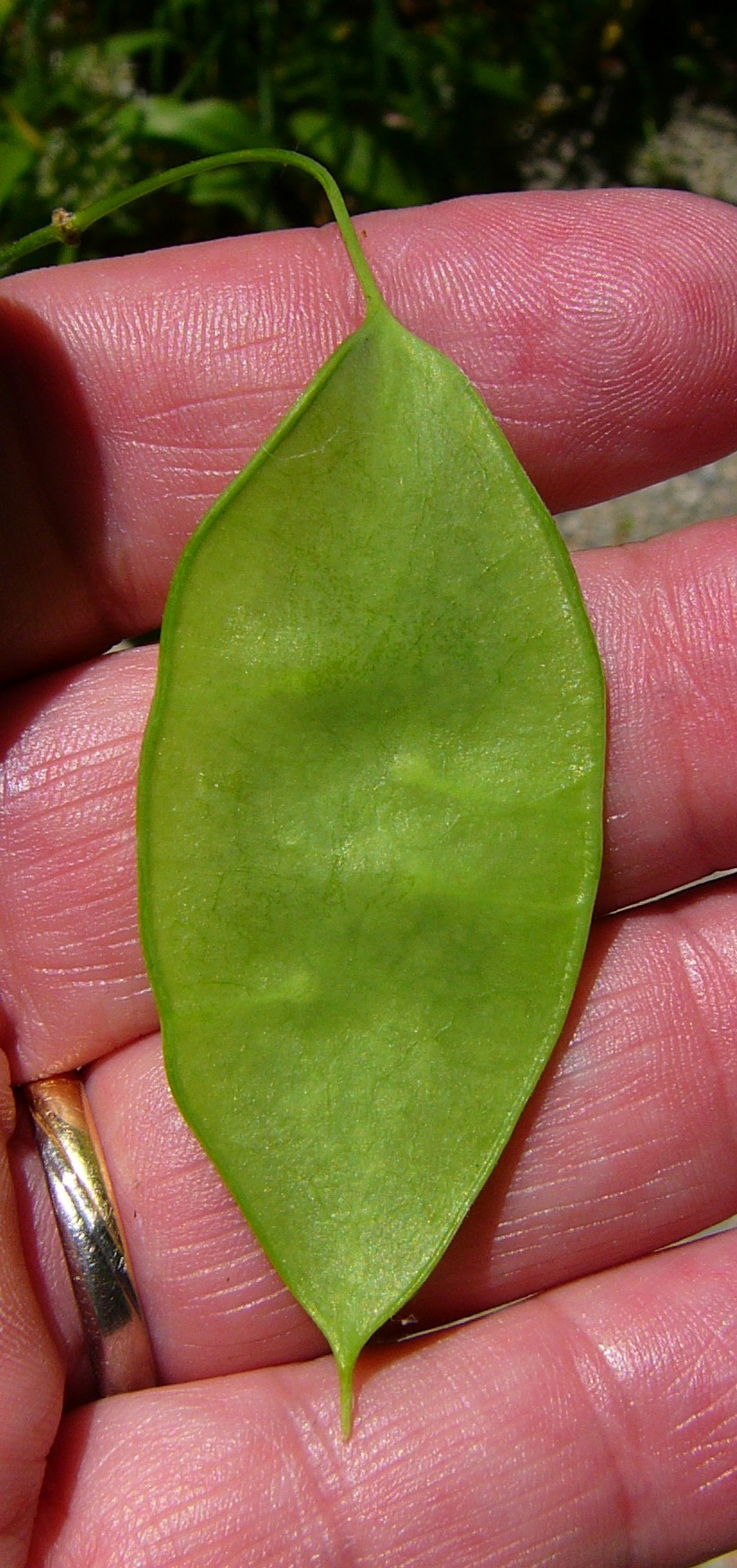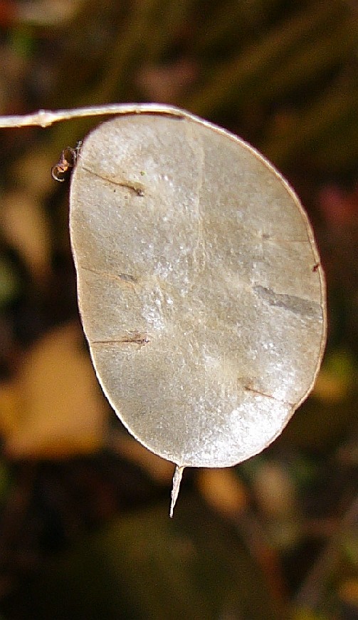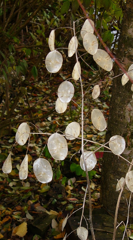 Kronblätter purpurrot mit dunkleren Nerven Früchte rundlich, an beiden Enden abgerundet Schötchen an einem 1 - 2 cm langen geraden Fruchtträger hängend; nach dem Ausfallen der Samen werden die silbrigen Schötcheninnenseiten sichtbar, die recht ausdauernd an den getrockneten Sprossen verbleiben (Trockensträuße) Einzelne Schötchenhülle im Herbst Obere Blätter sitzend, herzförmig, gezähnt Untere Blätter gestielt