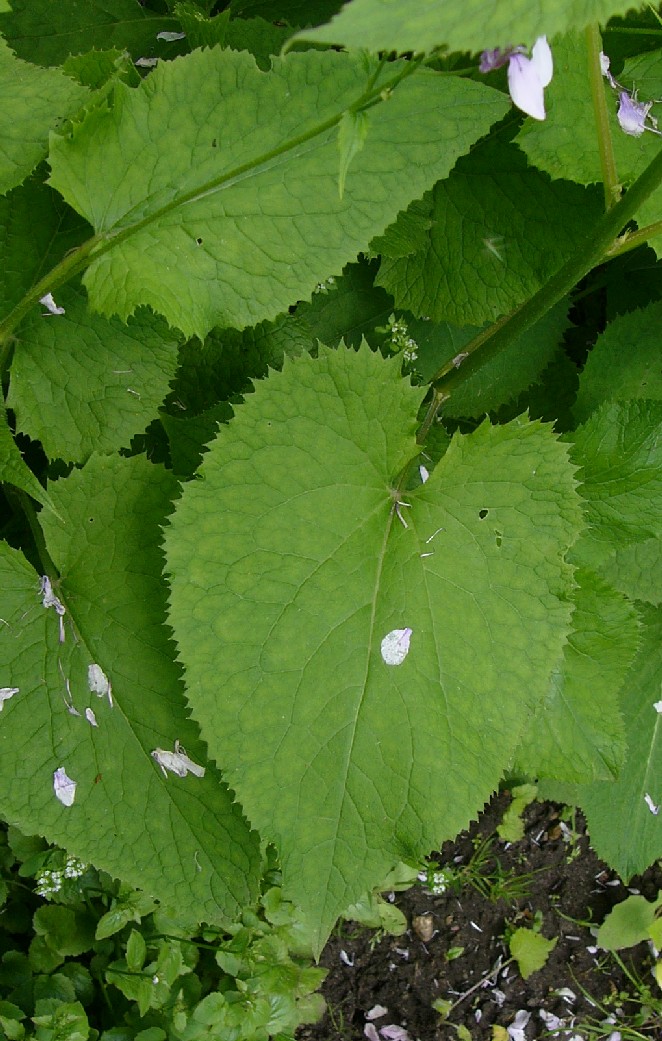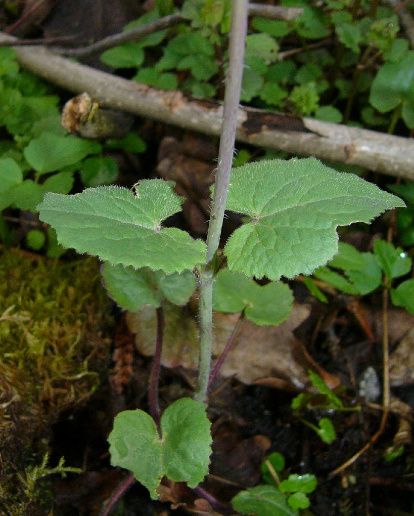 aufrecht, Stängel beblättert Kronblätter hellviolett bis fast weiß Früchte elliptisch, an beiden Enden spitz, oft verdreht, an einem 1 - 4 cm langen gebogenen Fruchtträger hängend Blätter herzförmig, scharf gezähnt Blätter deutlich gestielt