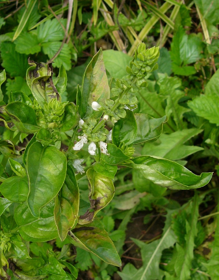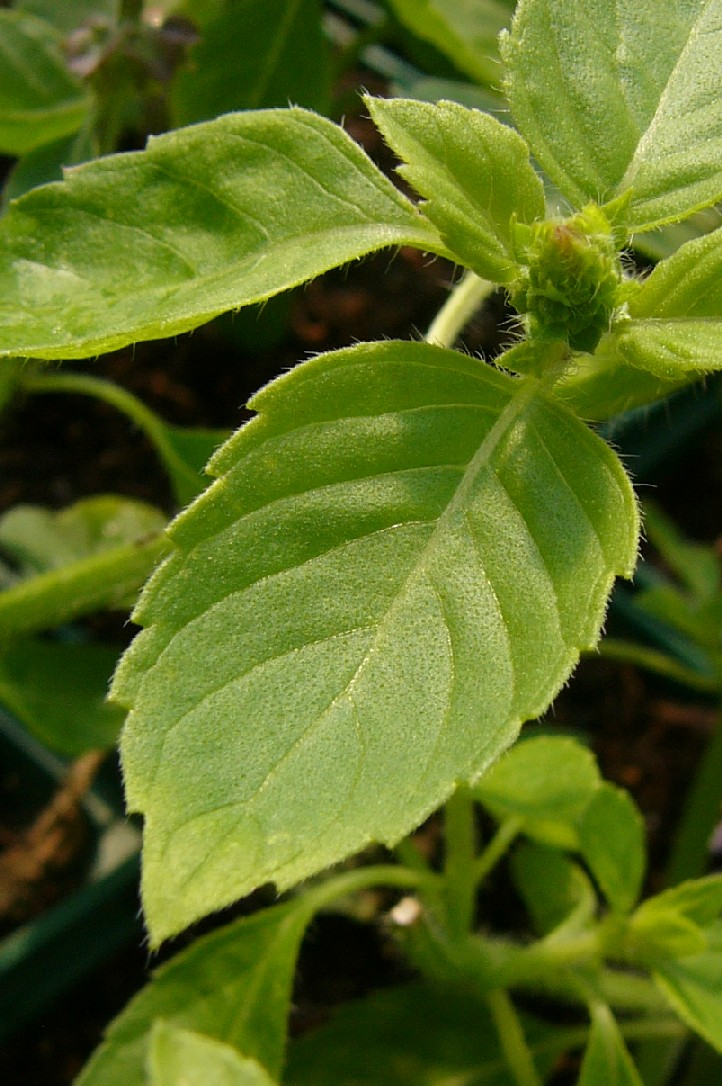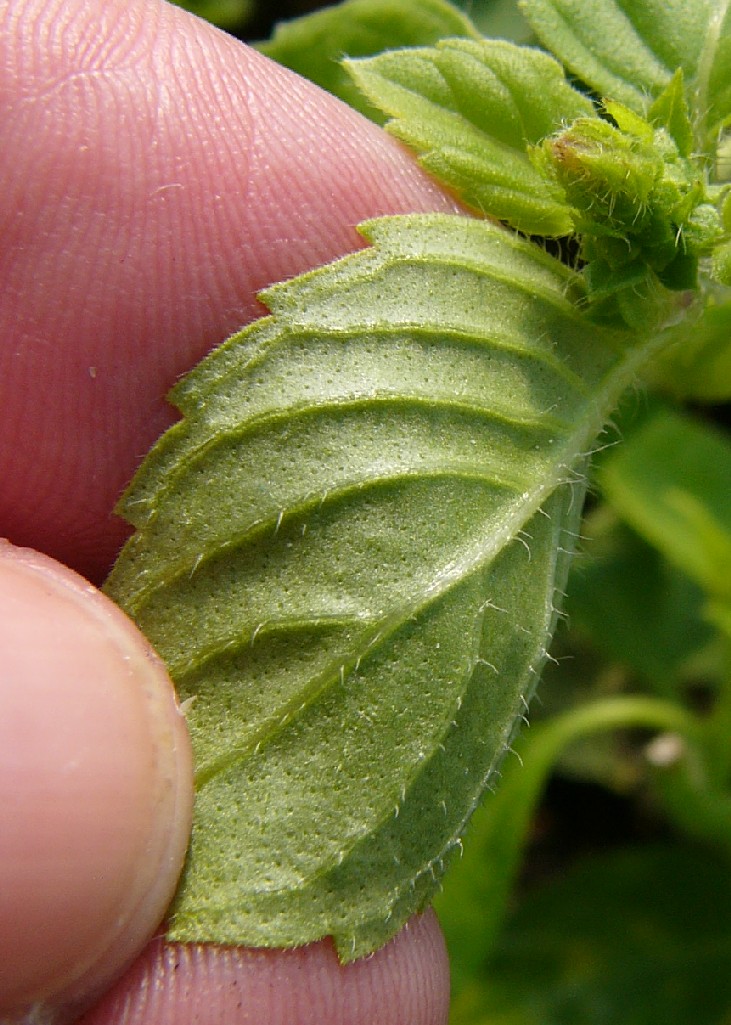 mit 4 Staubblättern, Unterlippe ungeteilt Stängelblätter eiförmig, gekerbt, 3 - 5 cm lang Blattunterseite grün, mit zahlreichen Drüsenpunkten