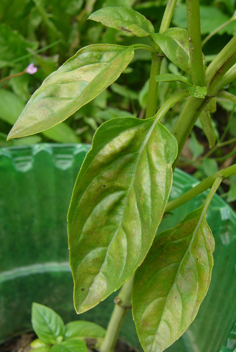 Stängelblätter eiförmig, gekerbt, oberseits grün, Blattnerven rötlich