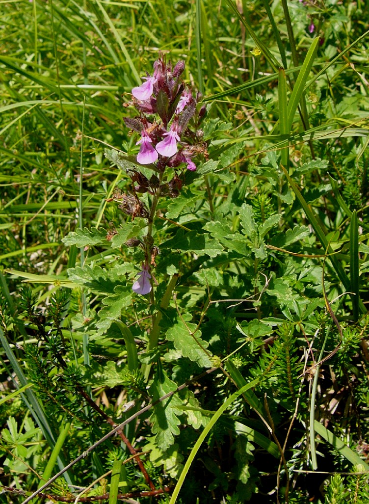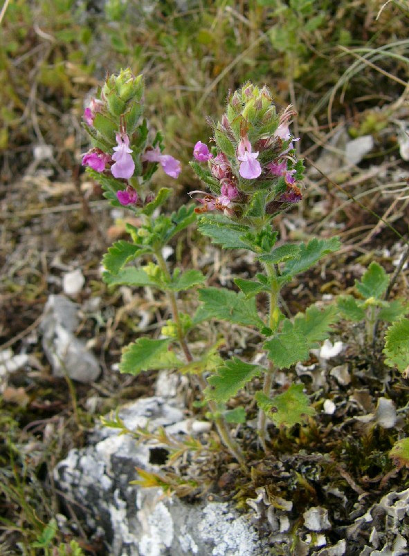 Pflanze 5 - 20 cm groß Mit niederliegenden, dünnen, stielrunden, graubraunen, stark verzweigten Ästen Blüten in einem wenigblütigem, köpfchenförmigen Blütenstand Oberlippe grünlich, mit roten Adern, tief 2- teilig, Unterlippe weiß, 3- lappig, mit großem Mittellappen