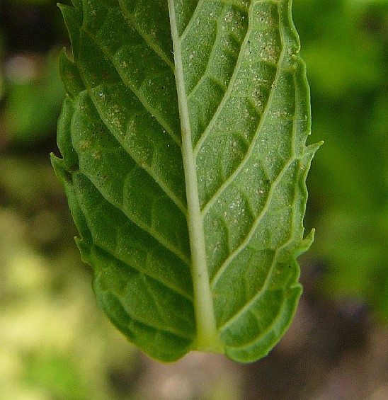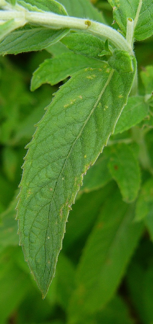 Blätter kreuz- gegenständig, länglich- lanzettlich, 30 - 90 mm lang, 10 - 30 mm breit, scharf gesägt, +/- sitzend, am breitesten nahe der Mitte, am Blattgrund verschmälert