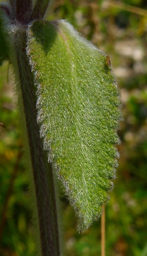 Kelchzähne ca halb so lang wie die Kelchröhre, dicht weißfilzig, drüsenlos Blätter 30 - 120 mm lang, 10 - 50 mm breit, länglich eiförmig, stark behaart, jung silbergrau, später grün, ringsum fein regelmäßig gekerbt, grüne Blattfläche unter der wollig- filzigen Behaarung sichtbar