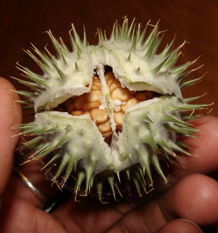 2 Blüten reinweiß, Früchte mit vielen kurzen Stacheln