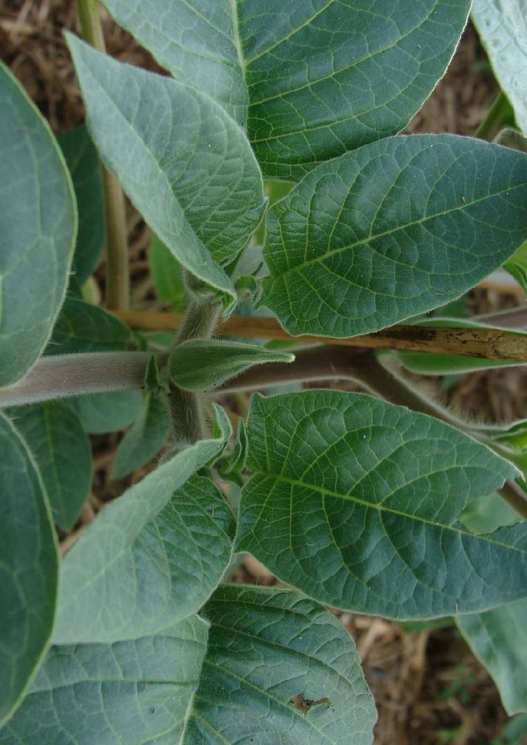 erscheinend Kelch samtig drüsenhaarig Früchte zur Reifezeit hängend, dicht behaart, Früchte bei Reife ungleichmäßig zerfallend, Junge Triebe dicht drüsenhaarig Blätter samtig weich, blaugrün, ganzrandig, im unteren Teil