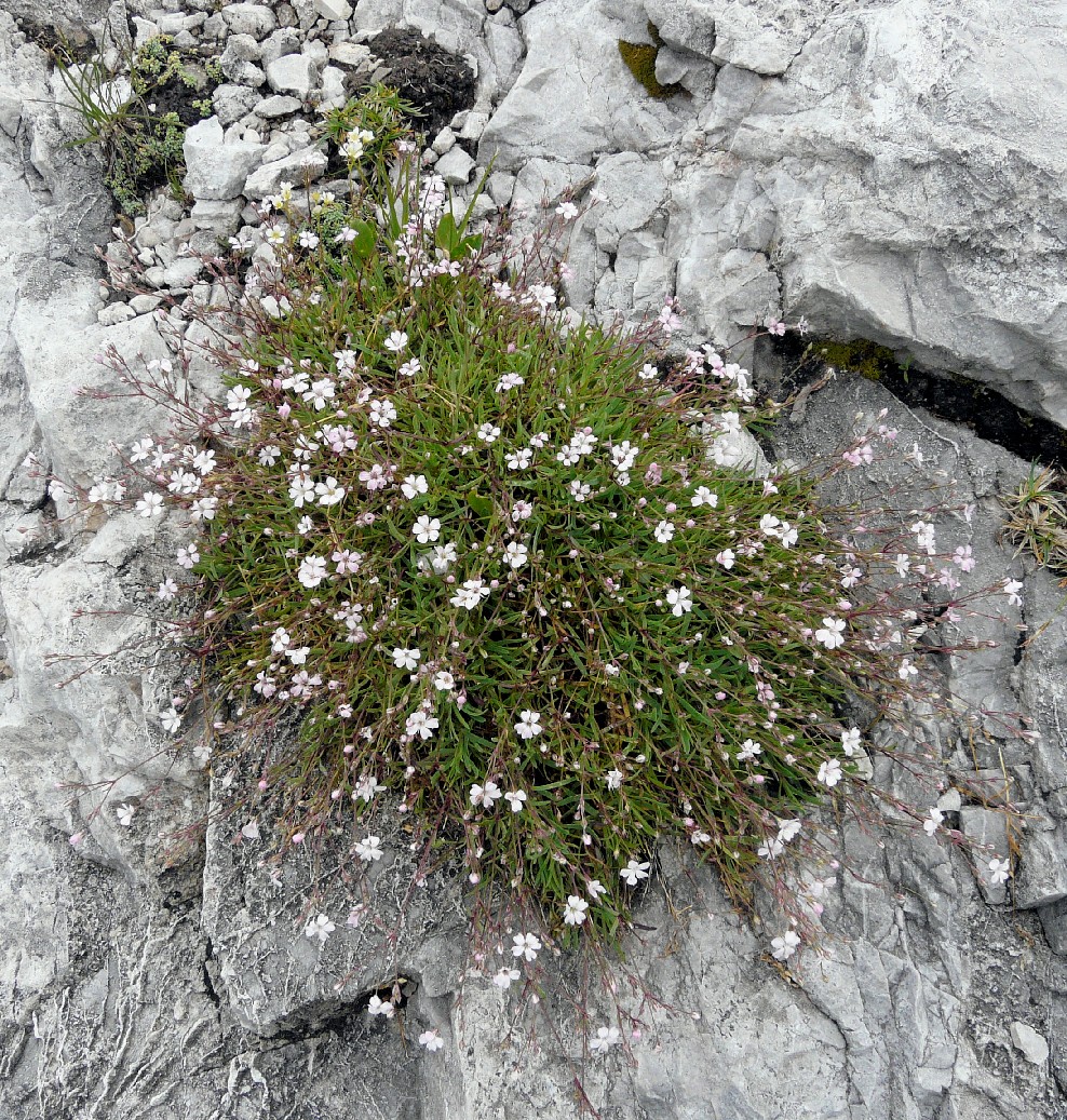 mit nichtblühenden Trieben, wächst über Kalk Blütenstand locker rispig Blüten vormännlich, 10 mm im Durchmesser, 5 Kronblätter, 5 Kelchblätter, 10 Staubblätter, 2 Griffel, Kronblätter rosa oder weiß, länger als Staubblätter und Griffel, ohne dunkle Streifen Kronblätter vorne gerundet oder schwach ausgrandet, mehr als doppelt, so lang wie der Kelch Kapsel eiförmig bis kugelig, mit 4 Zähnen