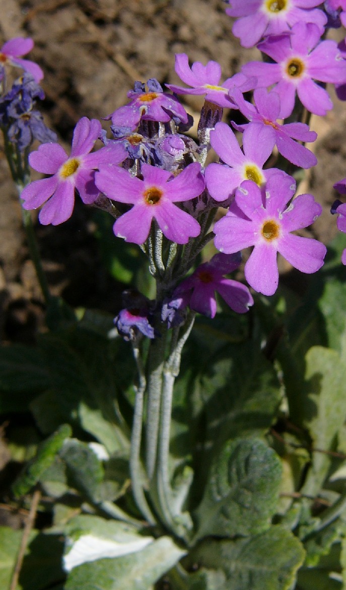 Rosa Primeln mit gelbem Schlund, Unterseite der Grundblätter mehlig