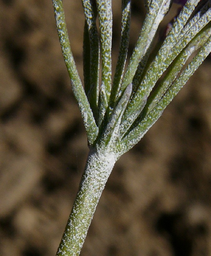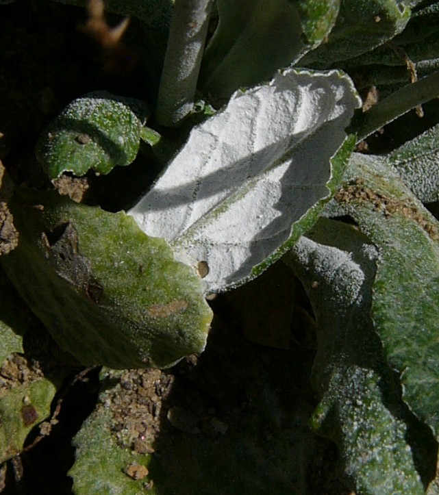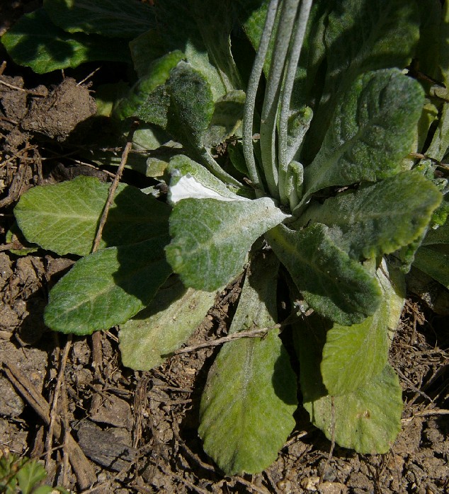 Stängel nicht beblättert, alle Blätter grundständig rosettig Blätter länglich, 1 - 10 cm lang 0,5 - 2 cm breit, ganzrandig oder schwach gesägt, unterseits dicht mehlig bestäubt