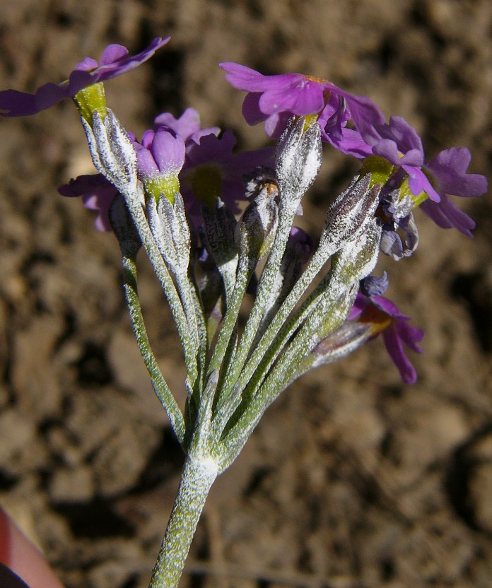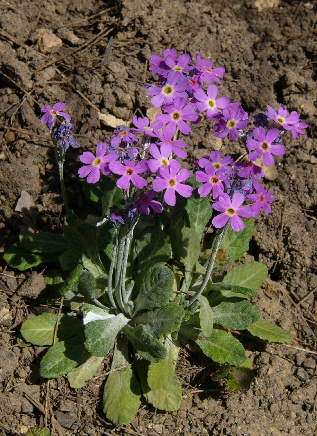 Pflanze 4 - 20 cm groß Blüten rosa mit gelbem Schlund, doldig gehäuft Hüllblätter der Dolde nicht ausgesackt Blätter spatelförmig, ganzrandig oder schwach