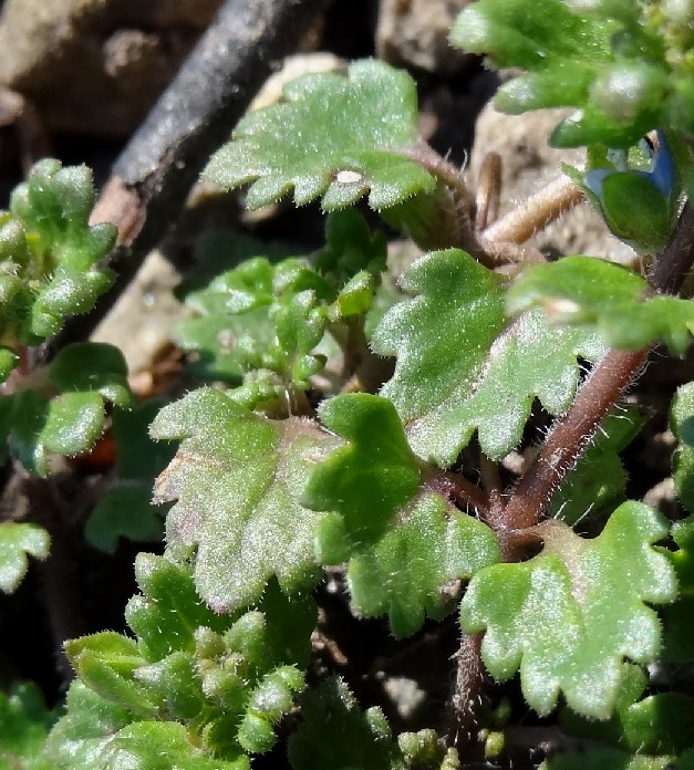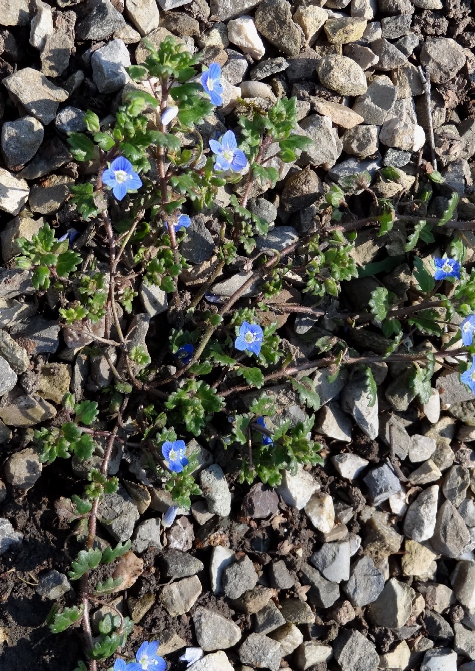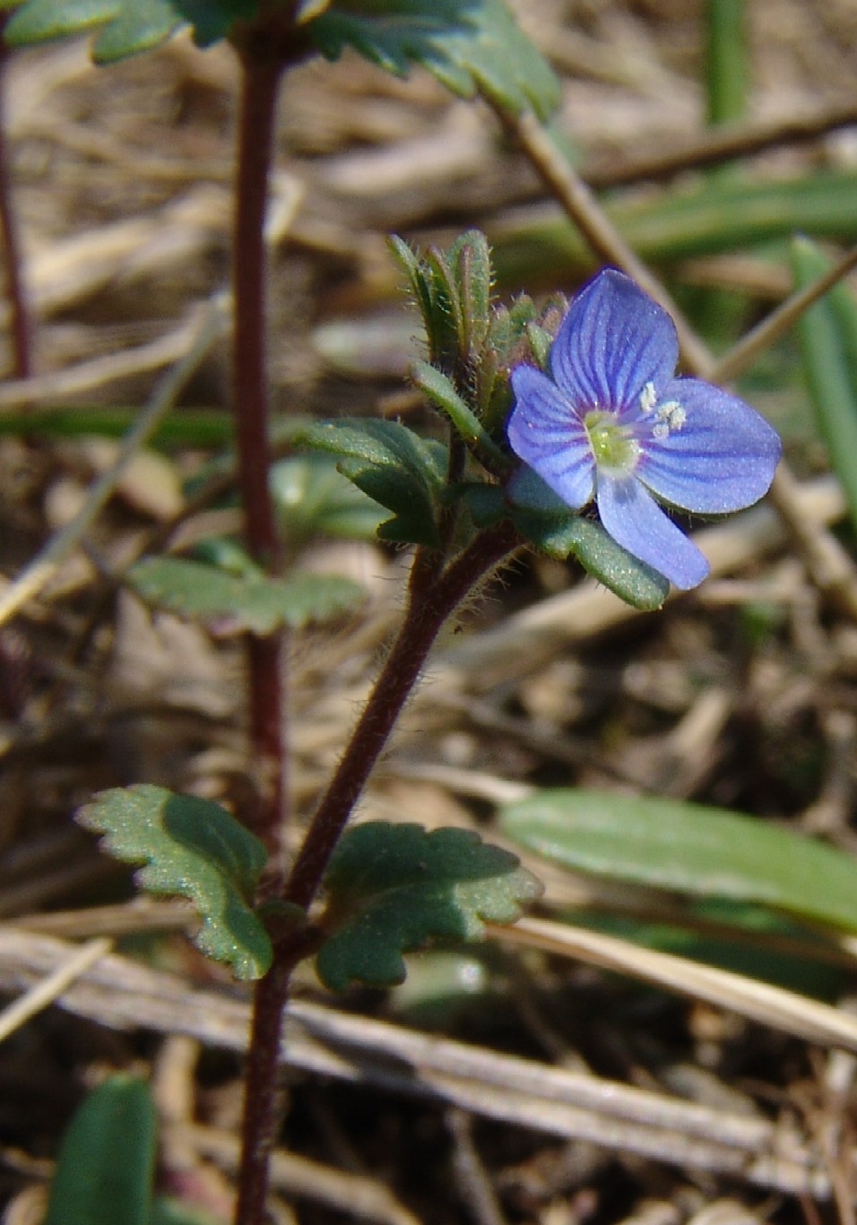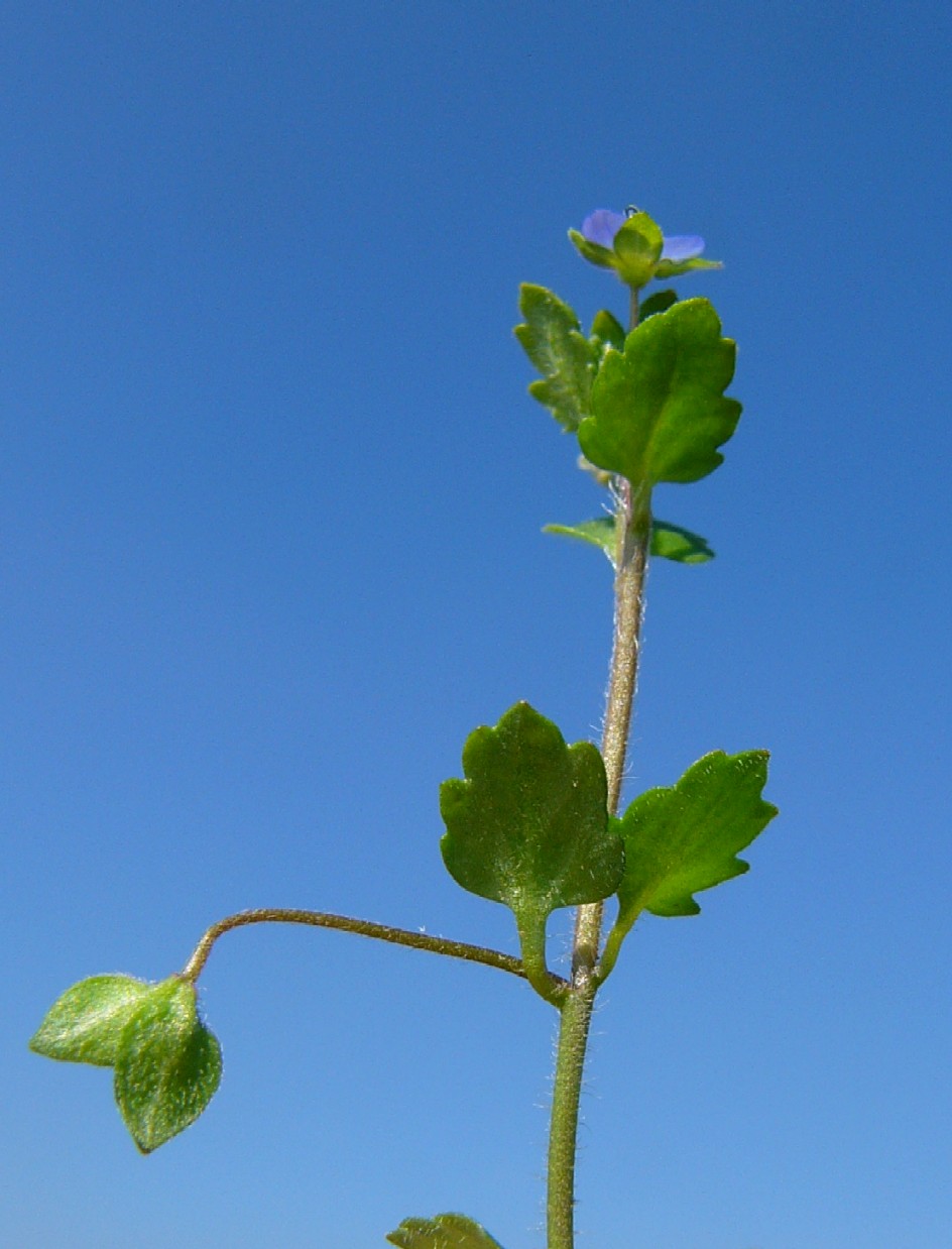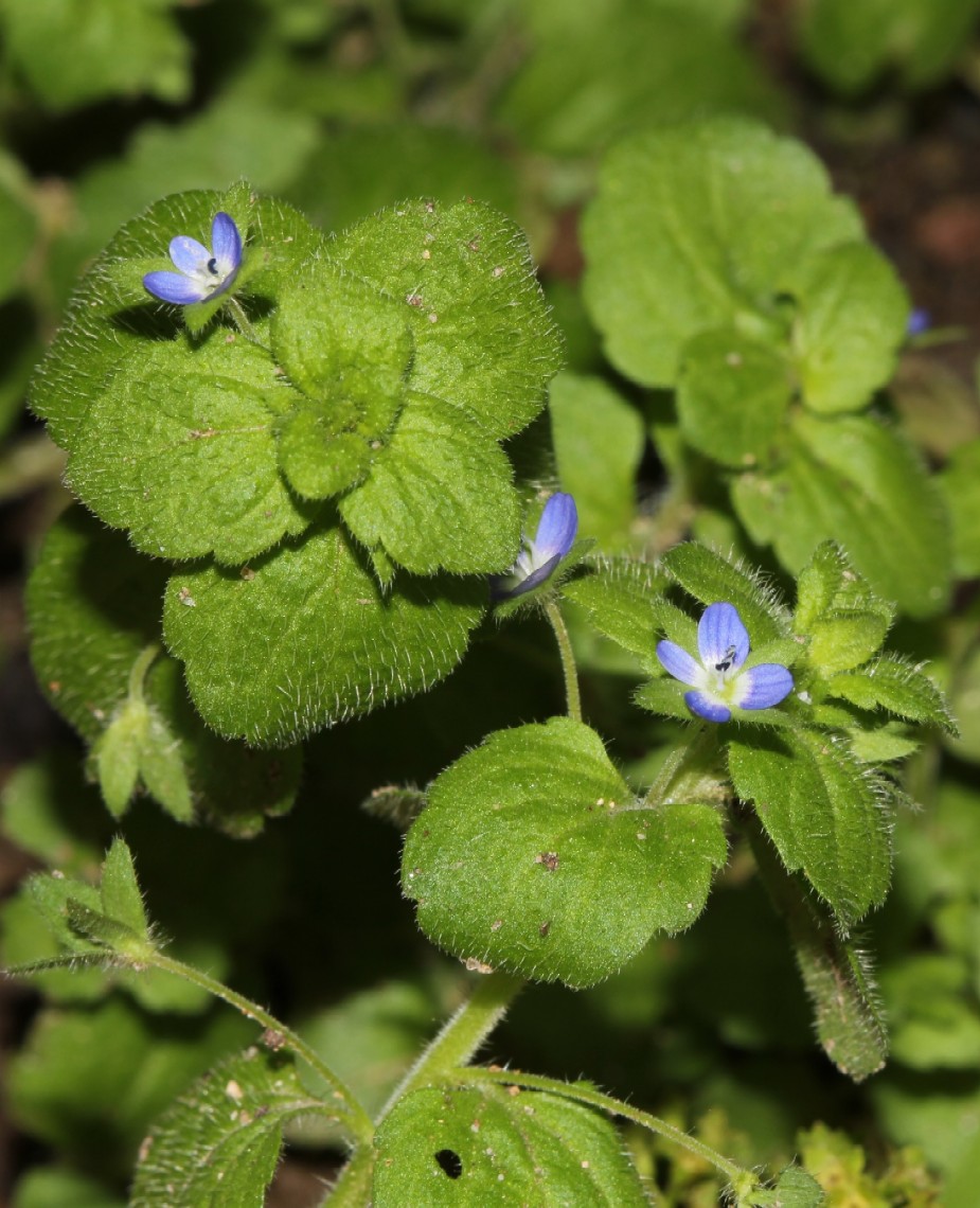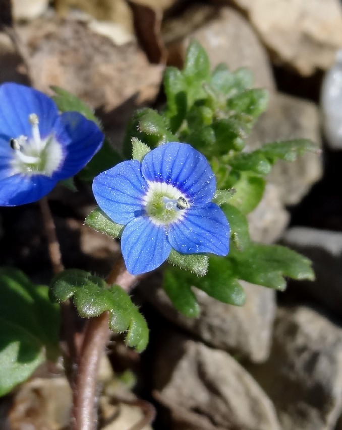 Blüten klein (5 - 7 mm), kräftig blau, oft mit violettem Ring, Kelchblätter breit