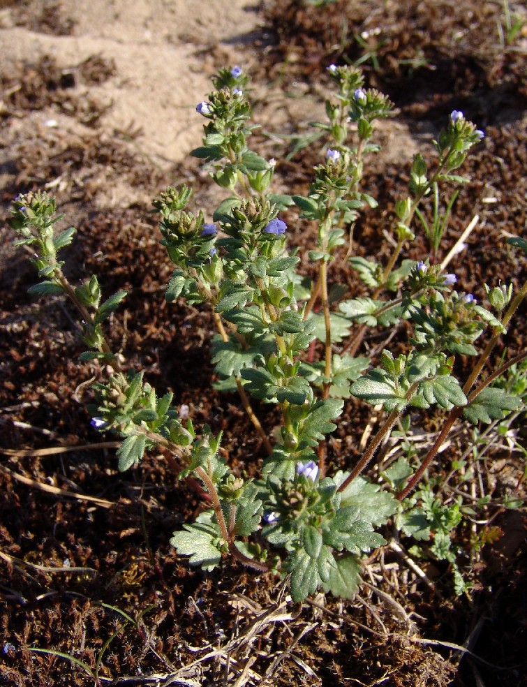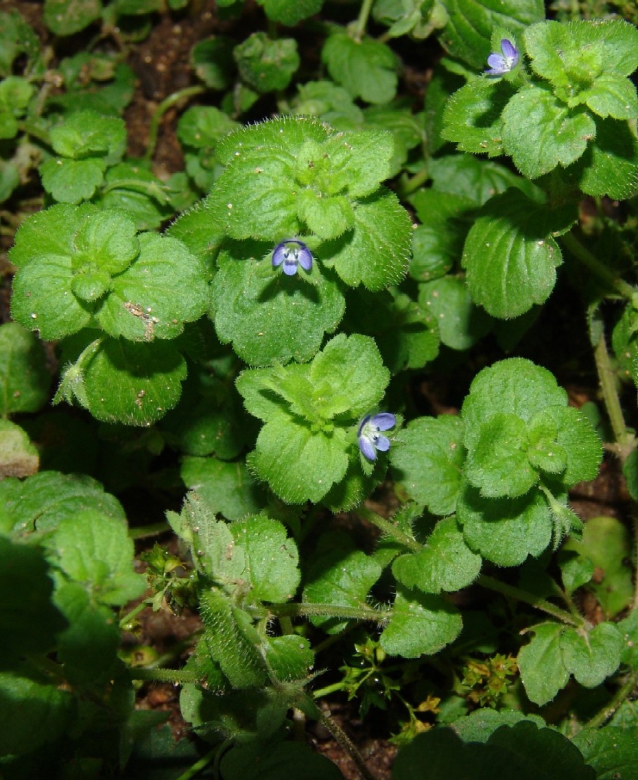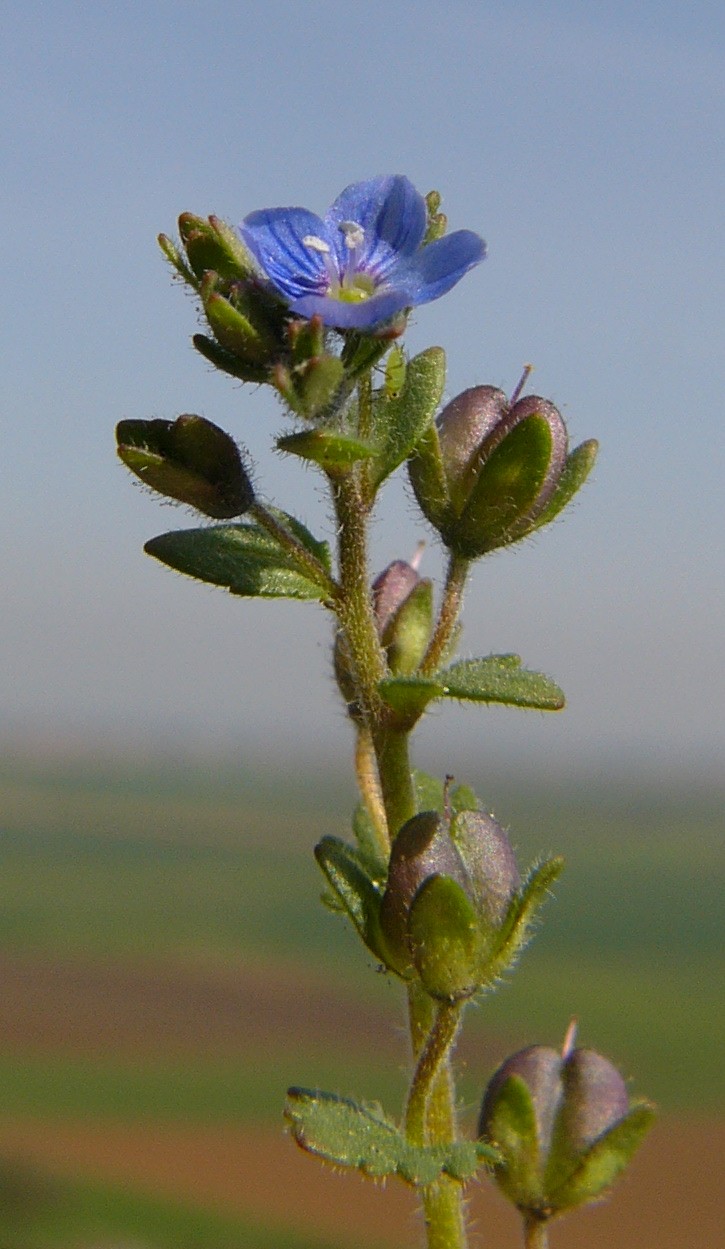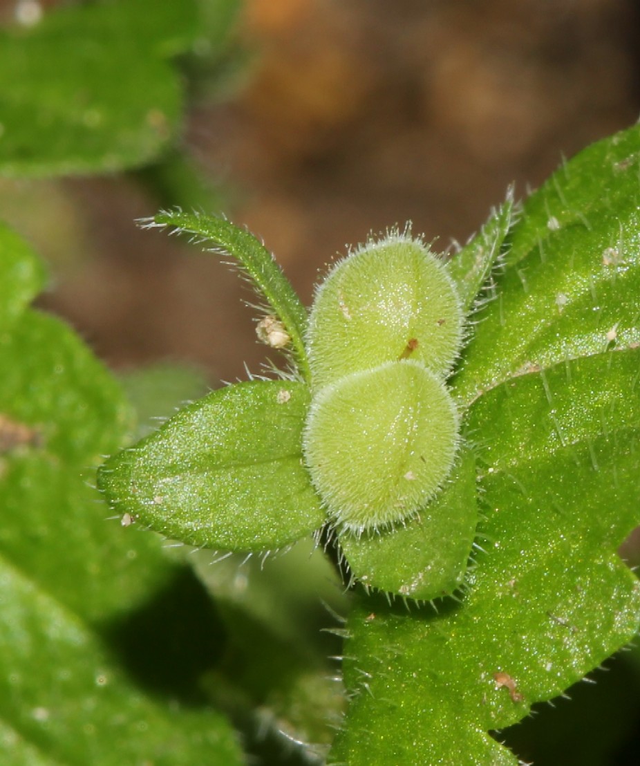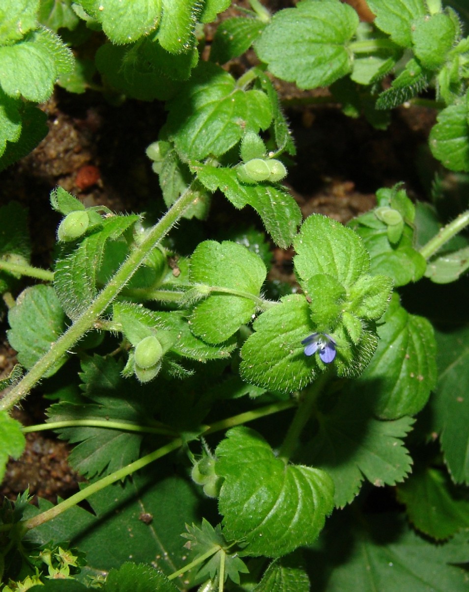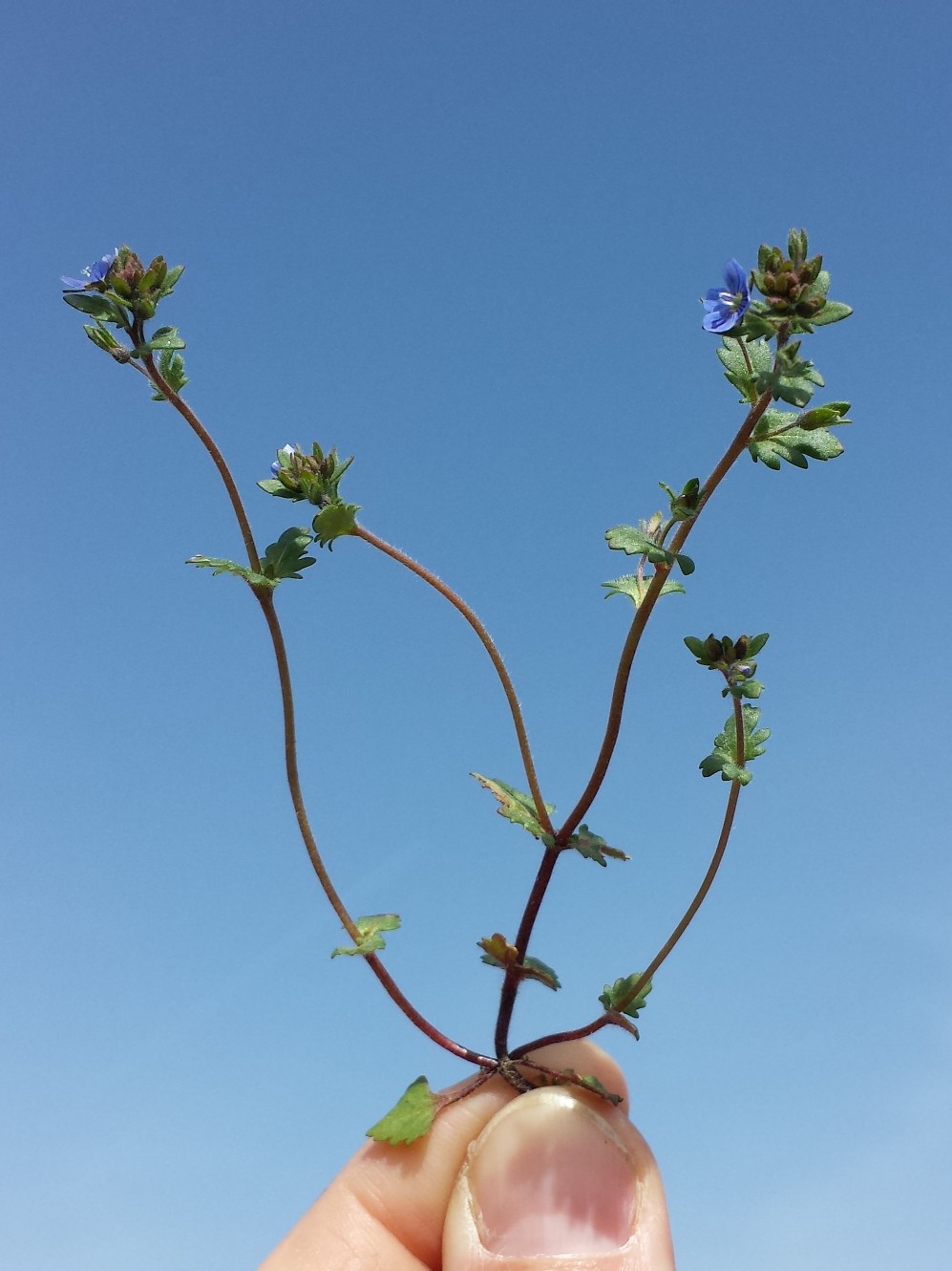 Blüten klein (5 - 7 mm), kräftig blau, oft mit violettem Ring, Kelchblätter breit