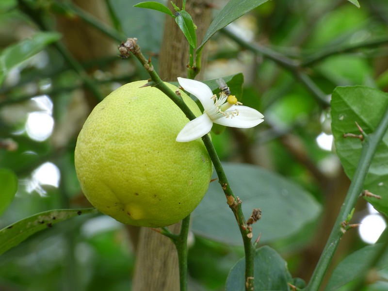 4 Reife Frucht klein (tischtennisballgroß), meist grün im Handel, süß oder sauer, Blüten rein weiß