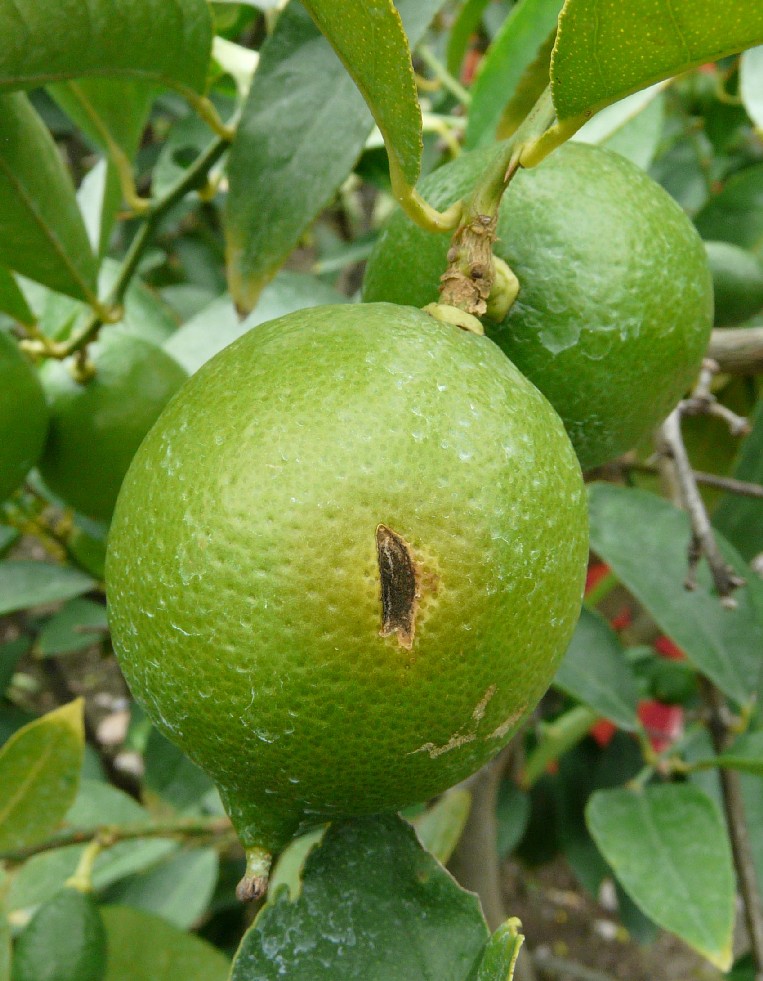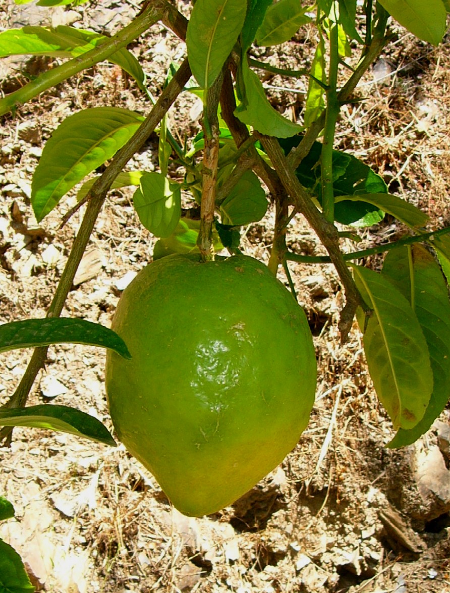 Reife Frucht etwa so groß wie ein Tischtennisball, meist grün im Handel, reif gelb, süß oder sauer, mit zitzenförmigem Ende Junge Zweige mit dünnen Dornen besetzt, Blattstiel kaum geflügelt