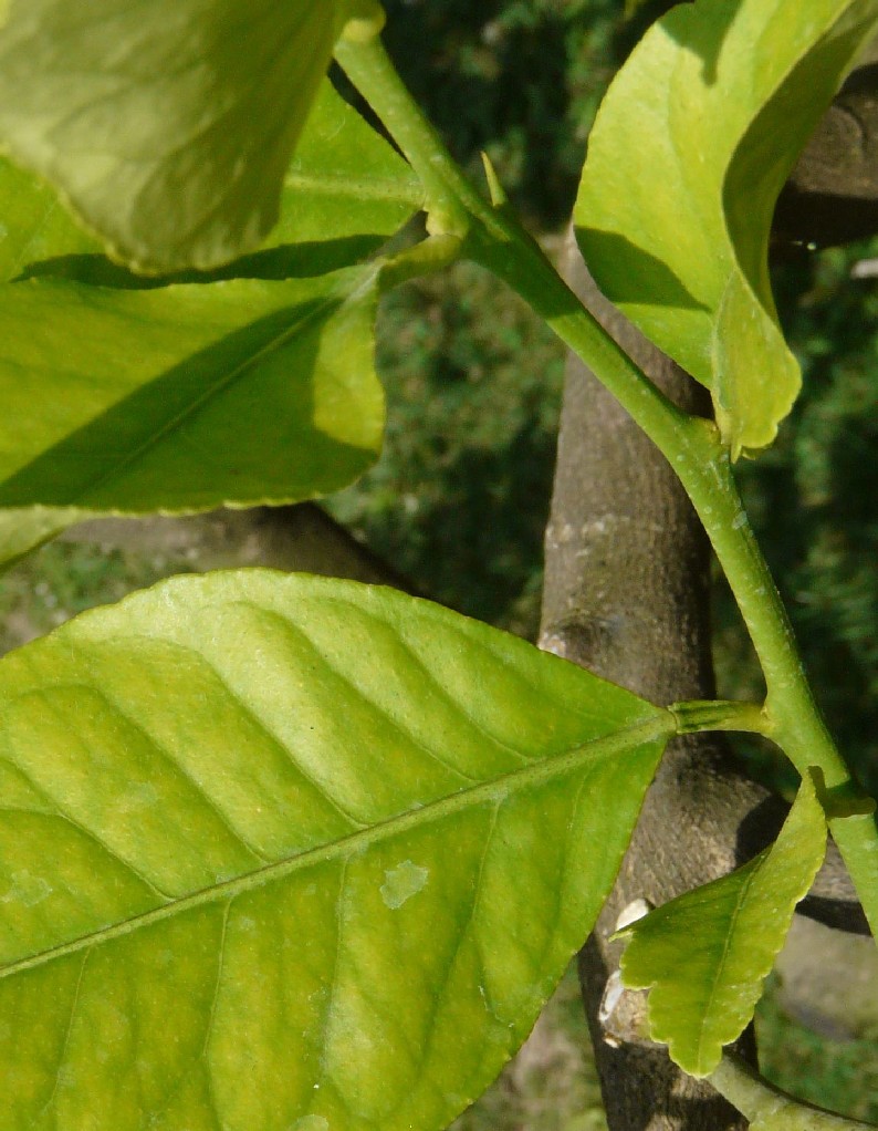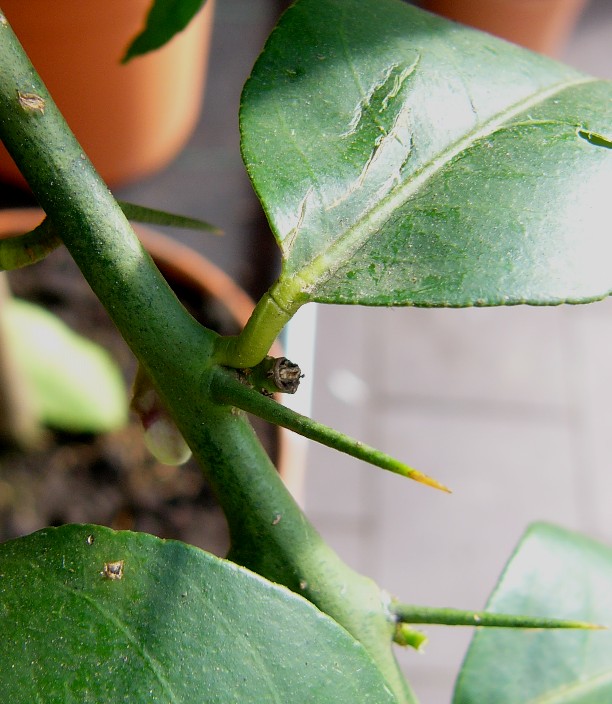 Junge Zweige mit dünnen Dornen besetzt, Blattstiel kaum geflügelt