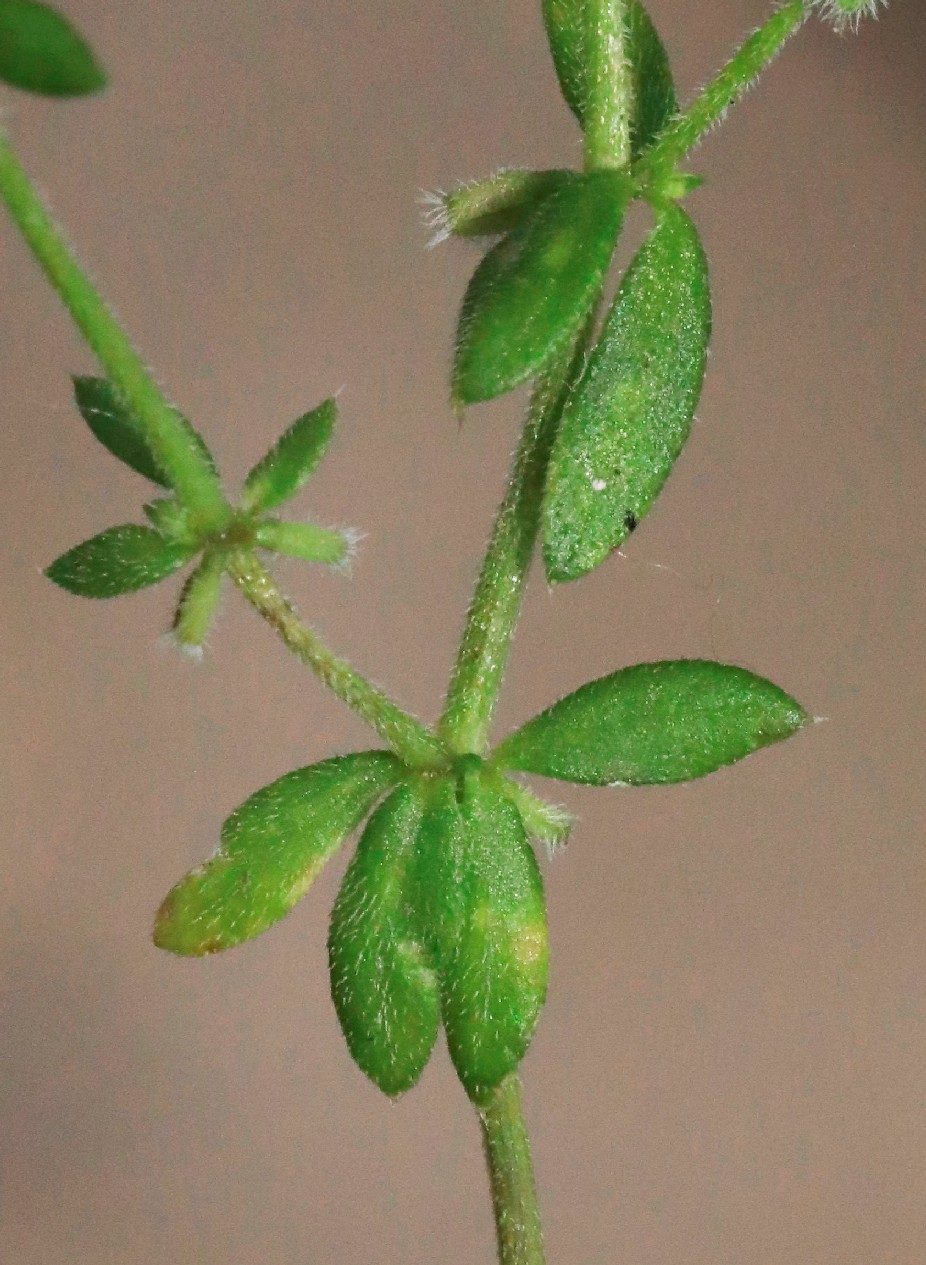 Blätter zu 4 - 6 im Quirl, im Blütenstand zu 2 - 3, Blüten sitzend oder kurz gestielt, zu 1 - 3 in den Blattachseln, ohne Teilblütenstandsstiele, Fruchtstiele zurückgebogen, Früchte 1,5 mm hoch, länger als breit > 1