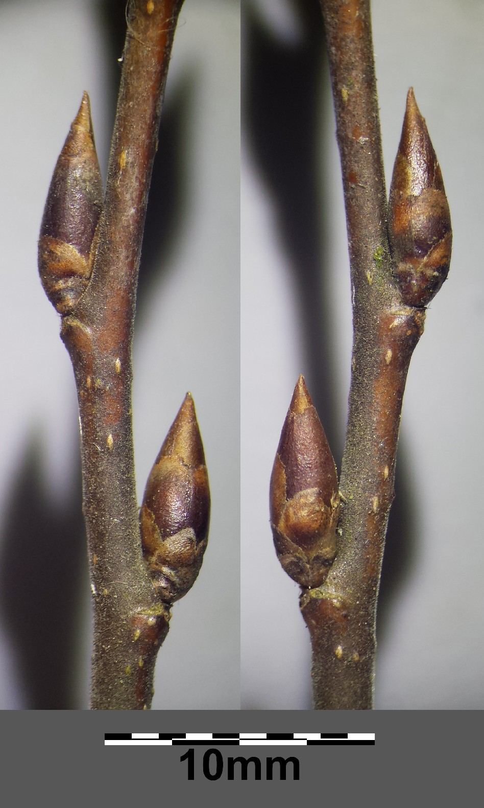 herzförmig, Blattunterseite je nach Unterart kahl oder auf den Nerven behaart Zweige +/- kahl, mit Lentizellen, ohne Stacheln