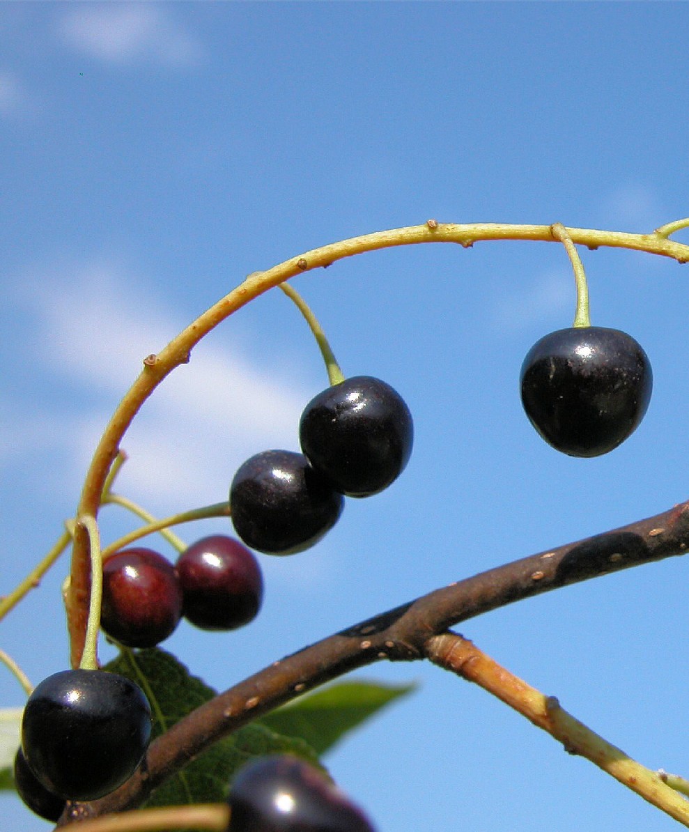 rundlich, Frucht rot, kugelig, 10 mm im Durchmesser, bitter, Steinkern glatt Blätter fein gezähnt, matt, Seitennerven einige mm vor dem Blattrand miteinander verbunden, Basis breit keilförmig bis abgerundet Blattunterseite kahl, in den Nervenwinkeln bebärtet