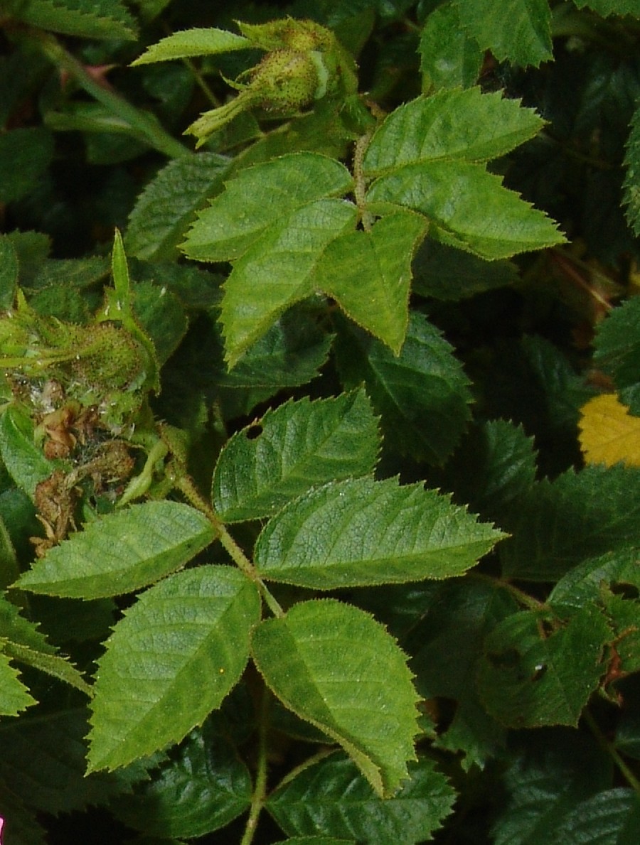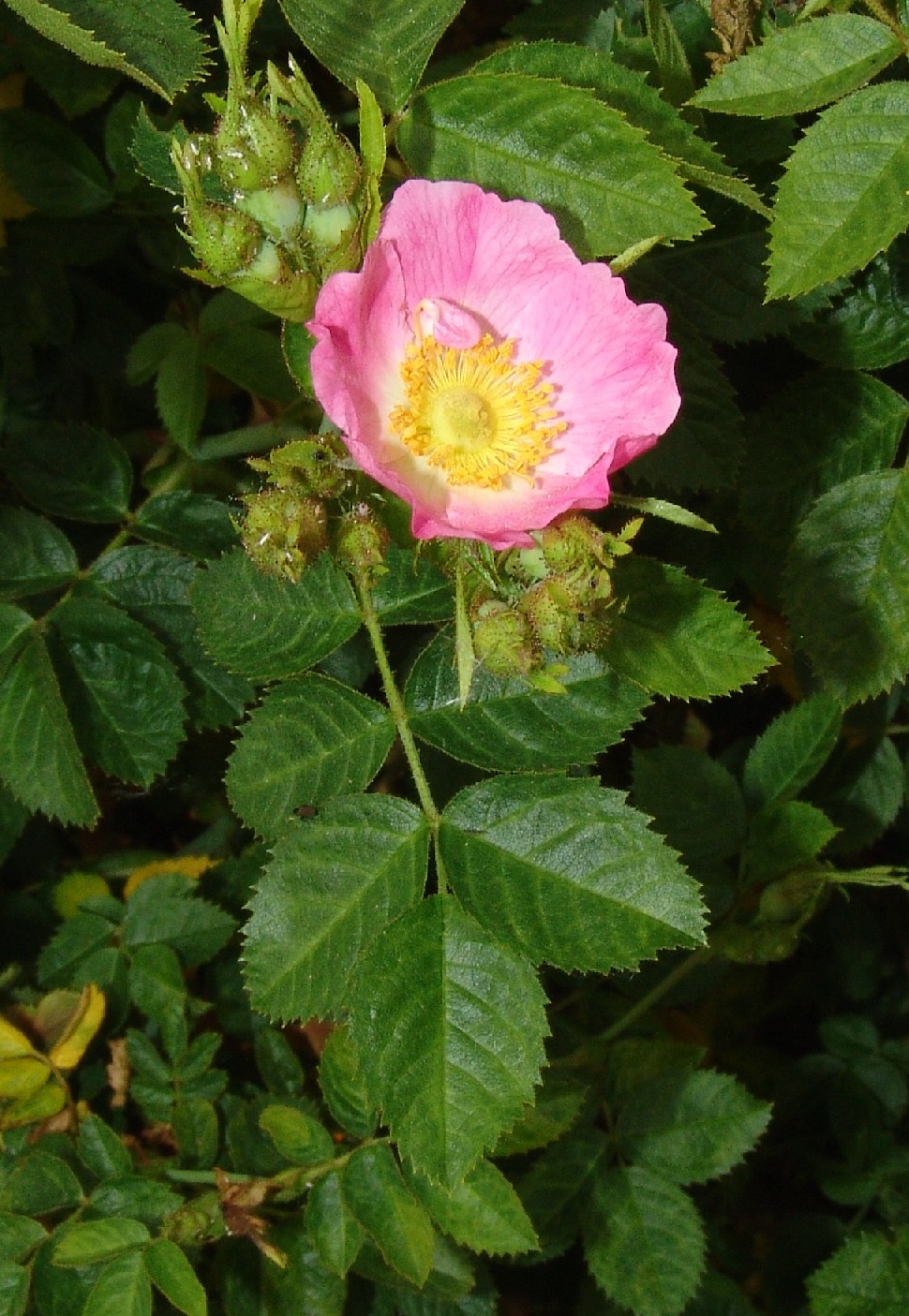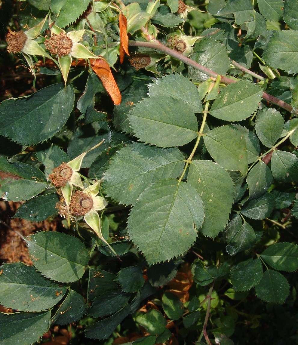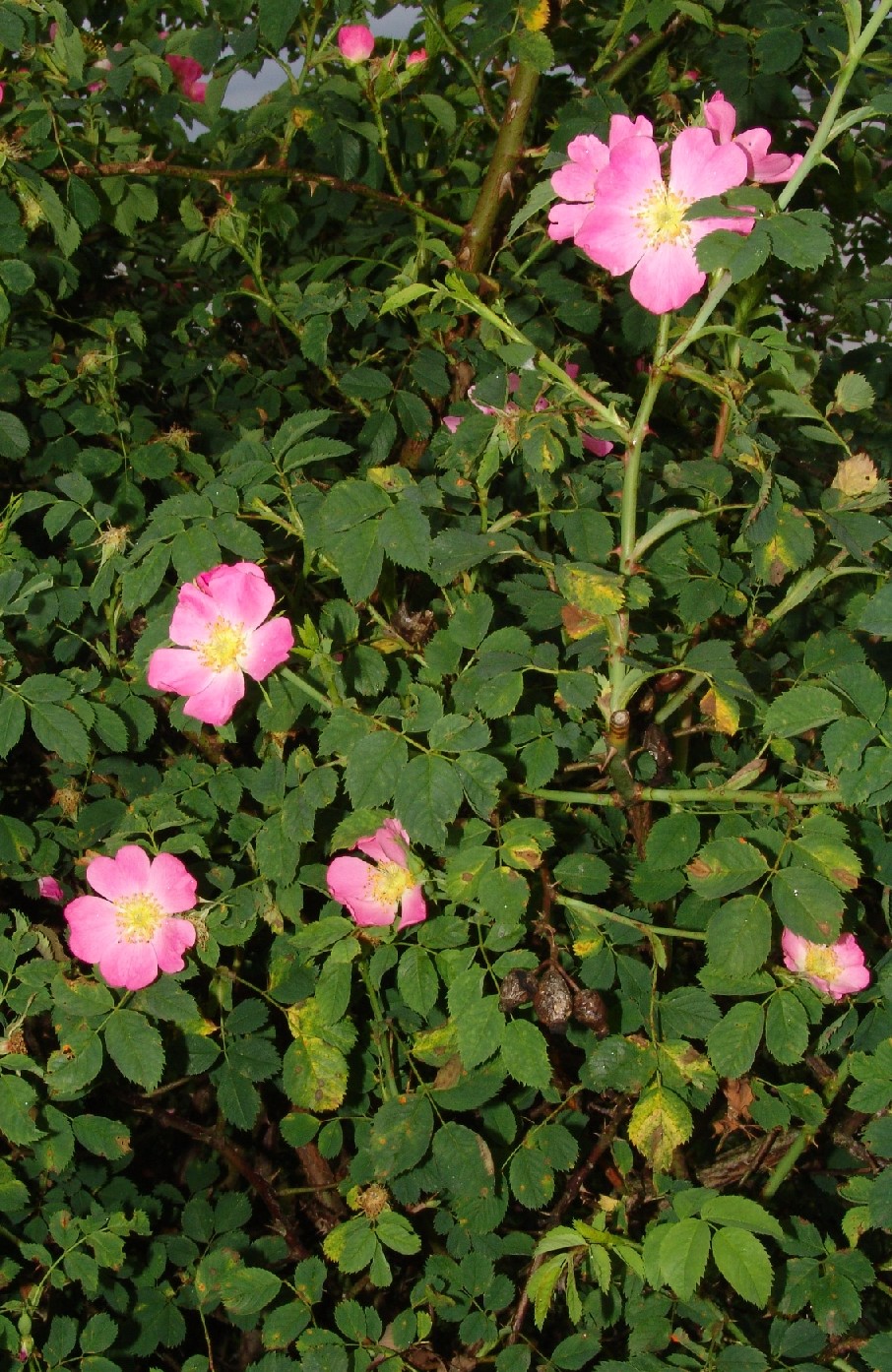 1 - 2 m großer gedrungener, dichter Strauch Frisch aufgeblühte Blüten kräftig rosa Narbenköpfchen hutförmig, wollig Reife Hagebutten rot, Fruchtstiele viel kürzer als die Frucht, oft von einem Hochblatt eingeschlossen, Kelchblätter haftend