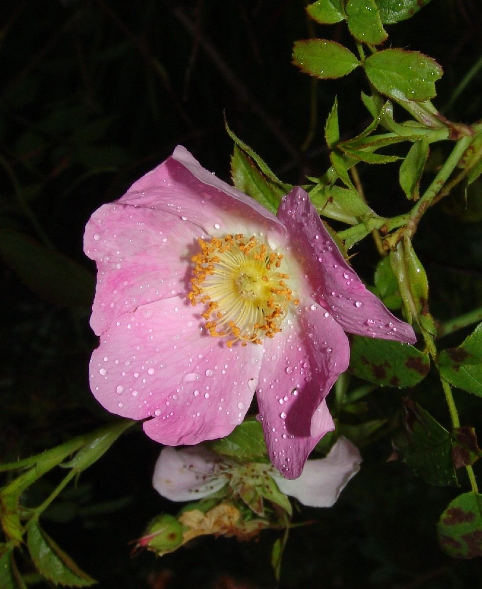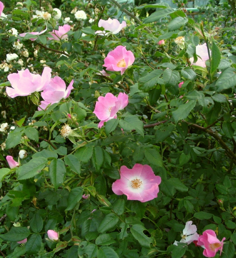 Strauch mit ausladenden, überhängenden oder klimmenden bis 5 m langen Zweigen Frisch aufgeblühte Blüten hellrosa Griffelkanal 0,5 - 0,8 mm im Durchmesser Kelchblätter anliegend, später abfallend Reife Hagebutten rot,
