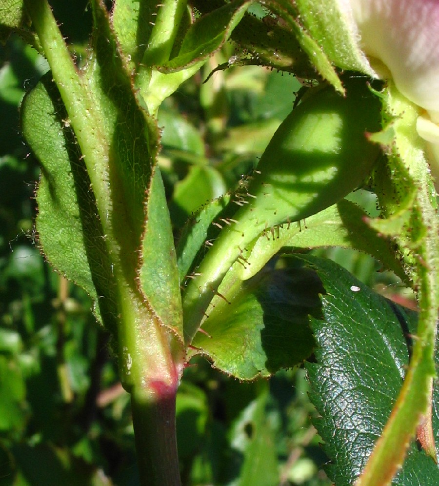 haftend Blattstiele kahl, meist mit Drüsen, oft auch mit Kleinstacheln Blättchen unterseits kahl, drüsenlos, bläulichgrün