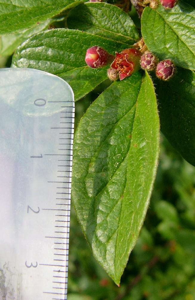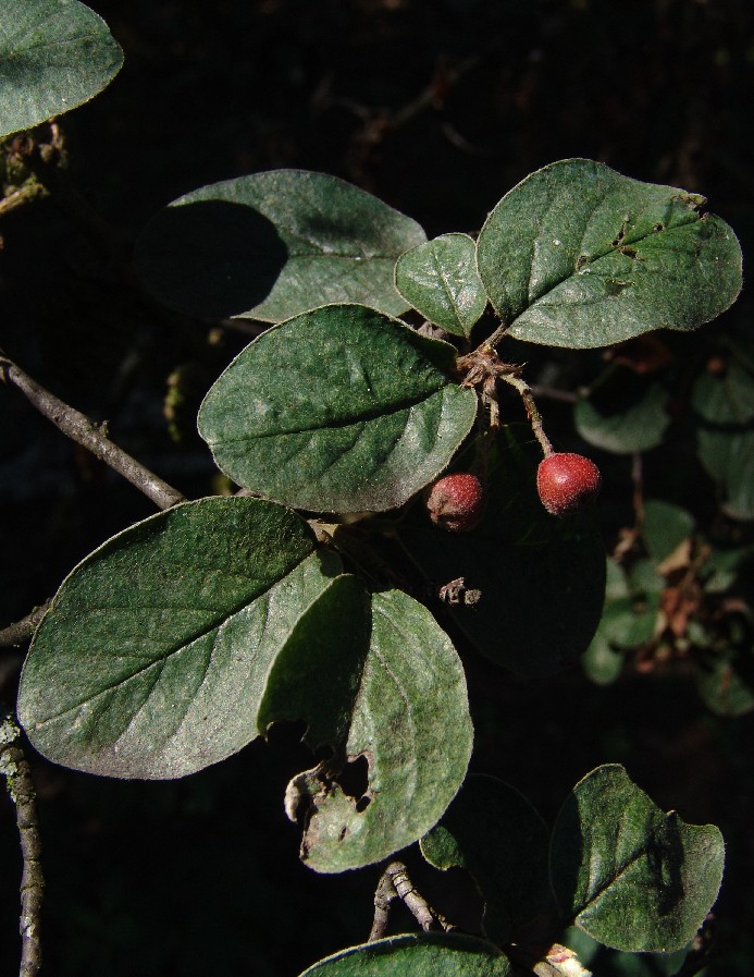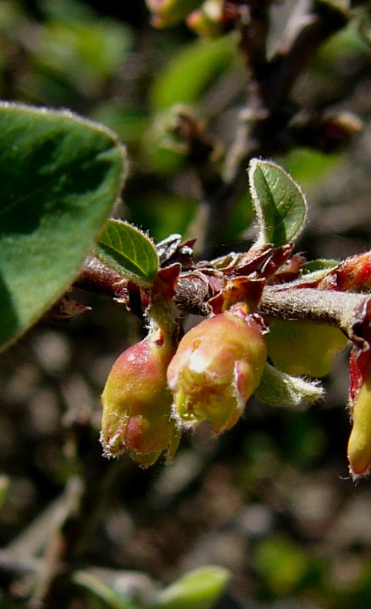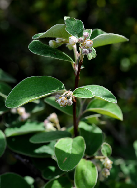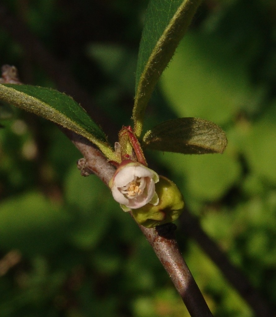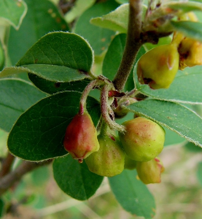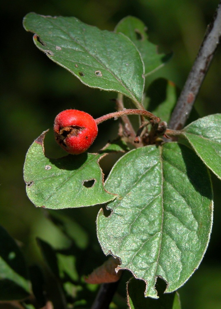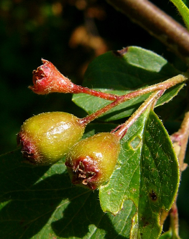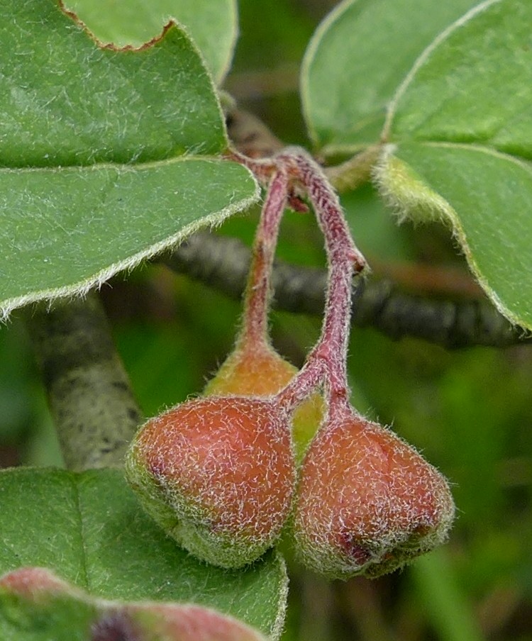 Hypanthium kahl, Blütenstiele etwas weichhaarig, später verkahlend Früchte kugelig, rot, 6 - 8 mm im Durchmesser, kahl Blätter eiförmig 1 - 4 cm lang Blätter stumpf oder ausgerandet oberseits kahl Blattunterseite graufilzig